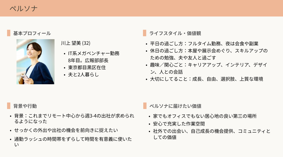 提供されたヒアリング動画、ペルソナの基本プロフィール、ライフスタイル・価値観をもとに、背景・課題、届けたい価値を考えた。