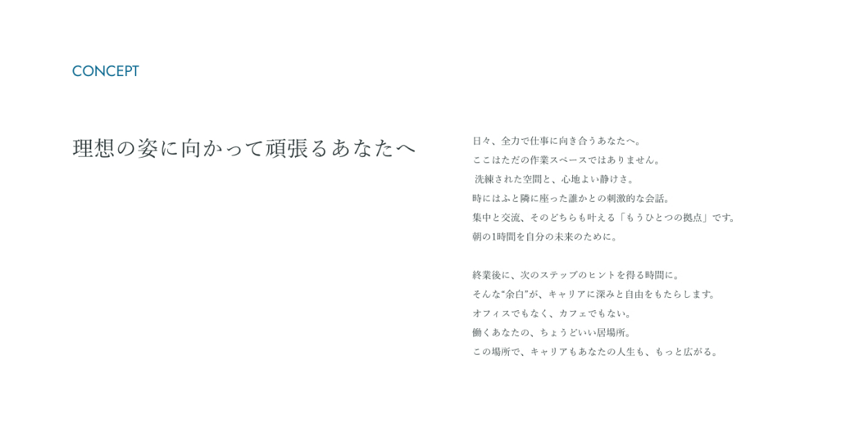 洗練された配色とフォント、そして広めの余白を活かすことで、高級感と心穏やかに仕事に向き合える「余裕」を表現しました。落ち着いて集中できるだけでなく、一歩踏み出すための「前向きな刺激」も感じられる世界観を目指しています。