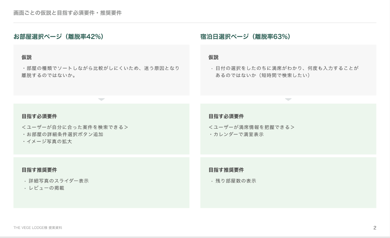 2.把握している状況:訪問自体は比較的多く、お部屋選択ページまで進んでくださる方も多いが、その後 の離脱が目立ち、なかなか予約完了に結びついていない状況