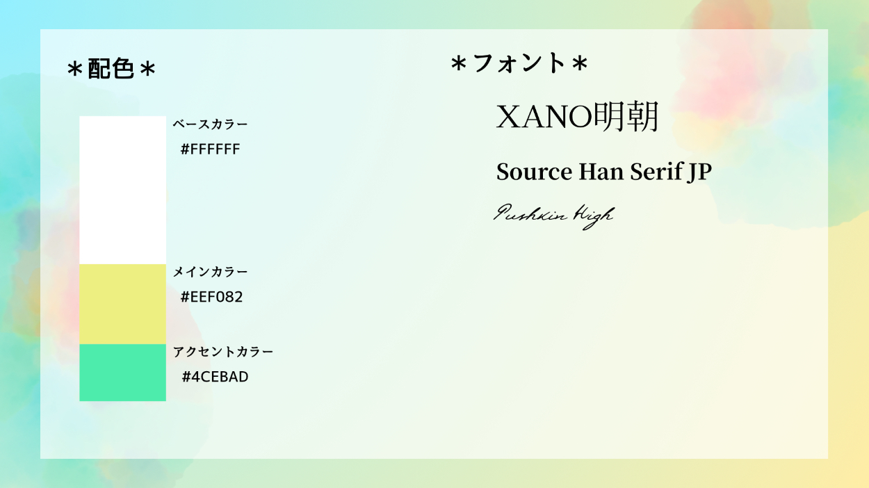 ペルソナにフェミニンなスタイルが好きとあるので、XANO明朝とSource Han Serif JPで上品さを表現し、アクセントに筆記体のフォントを入れて親しみやすさを表現しました。