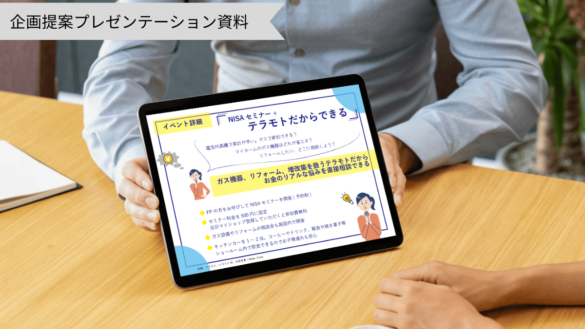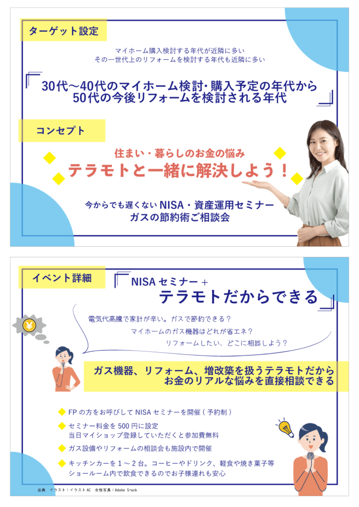 認知度・マイショップ登録のためにどういう世代をターゲットにし、 ショップ登録後もサービスを利用してもらうためには どのような企画内容にすべきかを考え、 NISA 講座とガス・リフォームの相談会を企画しました。