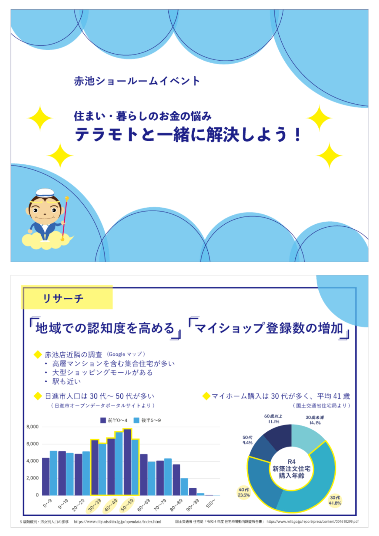 まず、カラーはテラモト様の公式ホームページの色合いを意識して 水色や差し色の黄色を中心にデザインしました。 また、日進市・国土交通省のデータに関しては数値データから Canva を使用し、グラフ化することで視認性を上げました。