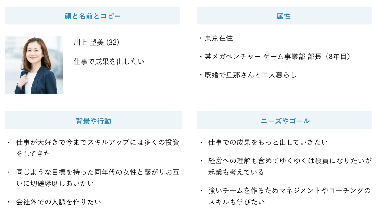 女性向けのビジネススクールを展開している会社。会員は20~30代の女性が多く、キャリアアップのためにビジネススキルを学び、さらにそのアウトプットの場として定期的にビジネスコンテストなどのイベントも開催されている。
