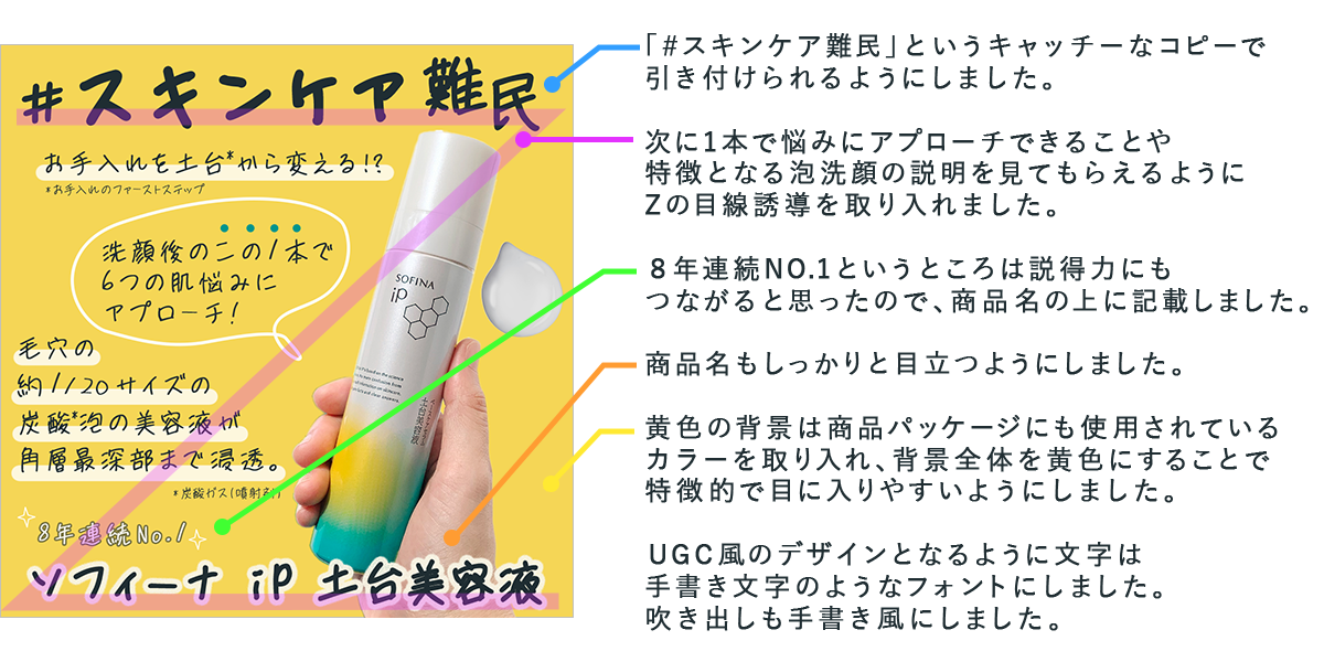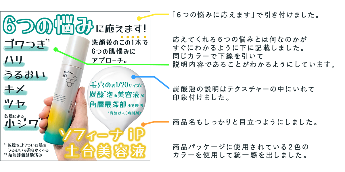 花王様のソフィーナ iP ベースケア セラム<土台美容液>の広告バナーを2作品制作しました。要件と2作品それぞれのデザインのポイントをまとめています。[制作期間:2日 使用ツール:Photoshop]