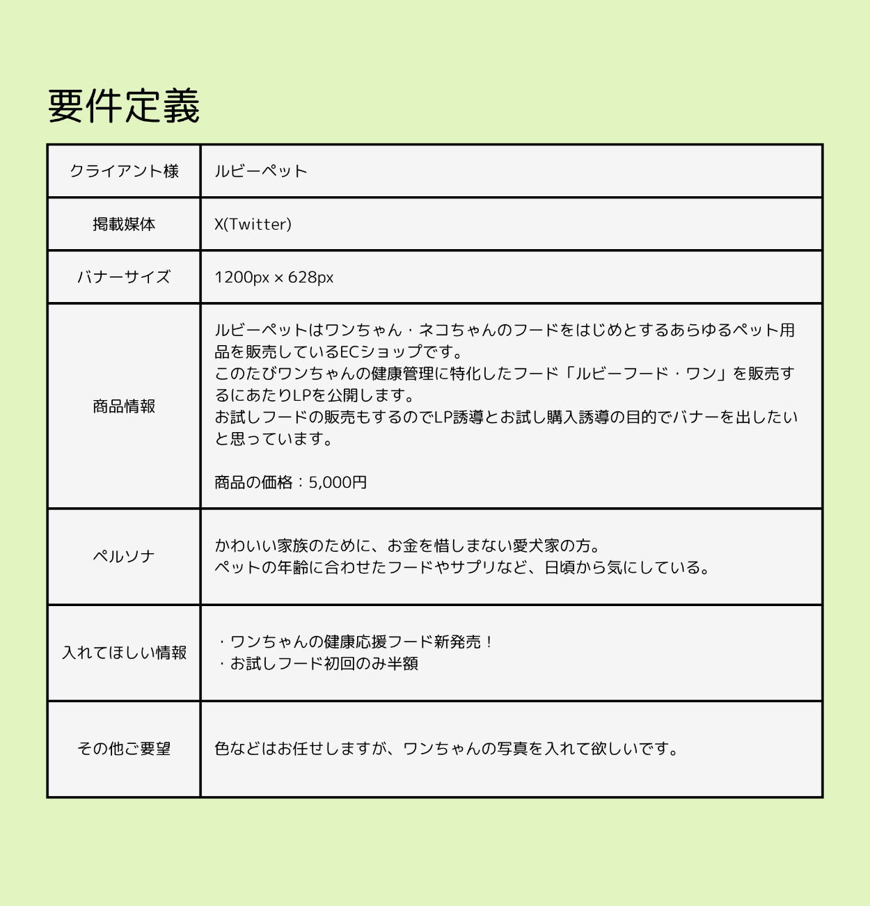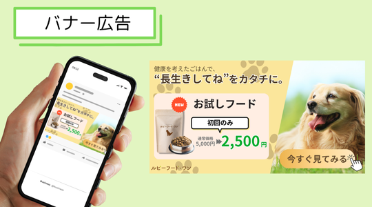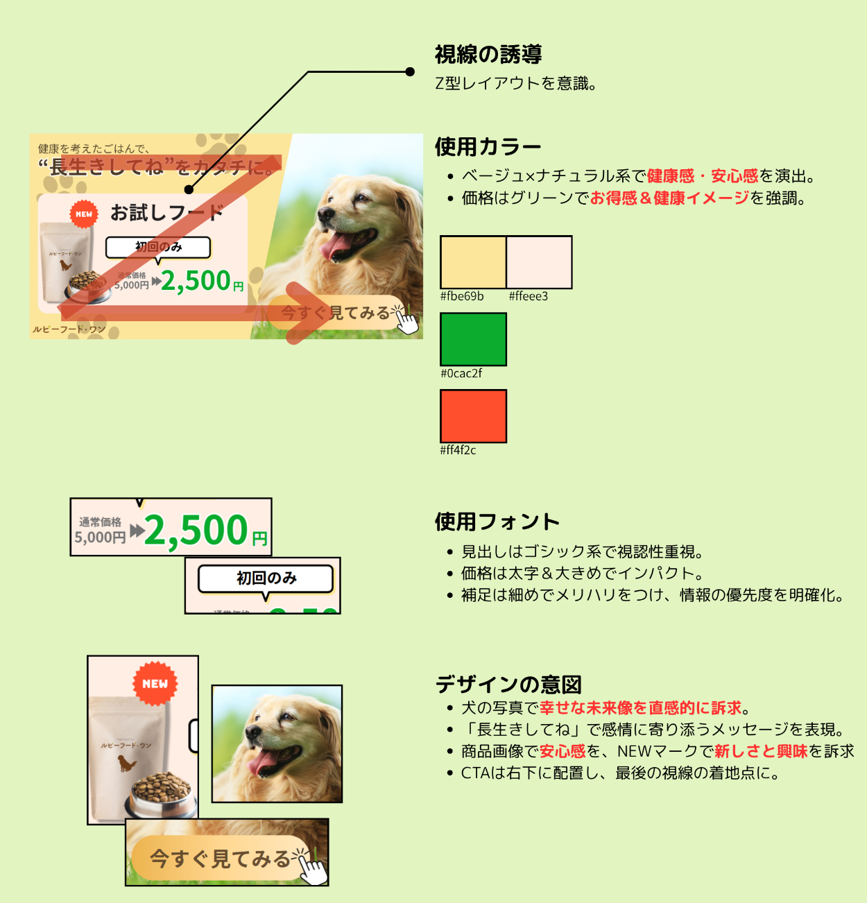 【架空案件】ペットフードのLP誘導バナー ザウルスデザインラボ フリーランスwebデザイナー OVERVIEW Hertechの課題にて、架空案件として「ペットフード」のバナー制作を行いました。 YEAR 2025 使用ツール:Canva作製時間 :3時間