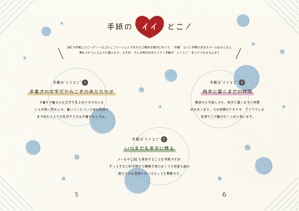 どのページにも細部に便箋の罫線のような水色の線を使ったことで手紙らしさのあるデザインになるようこだわりました。