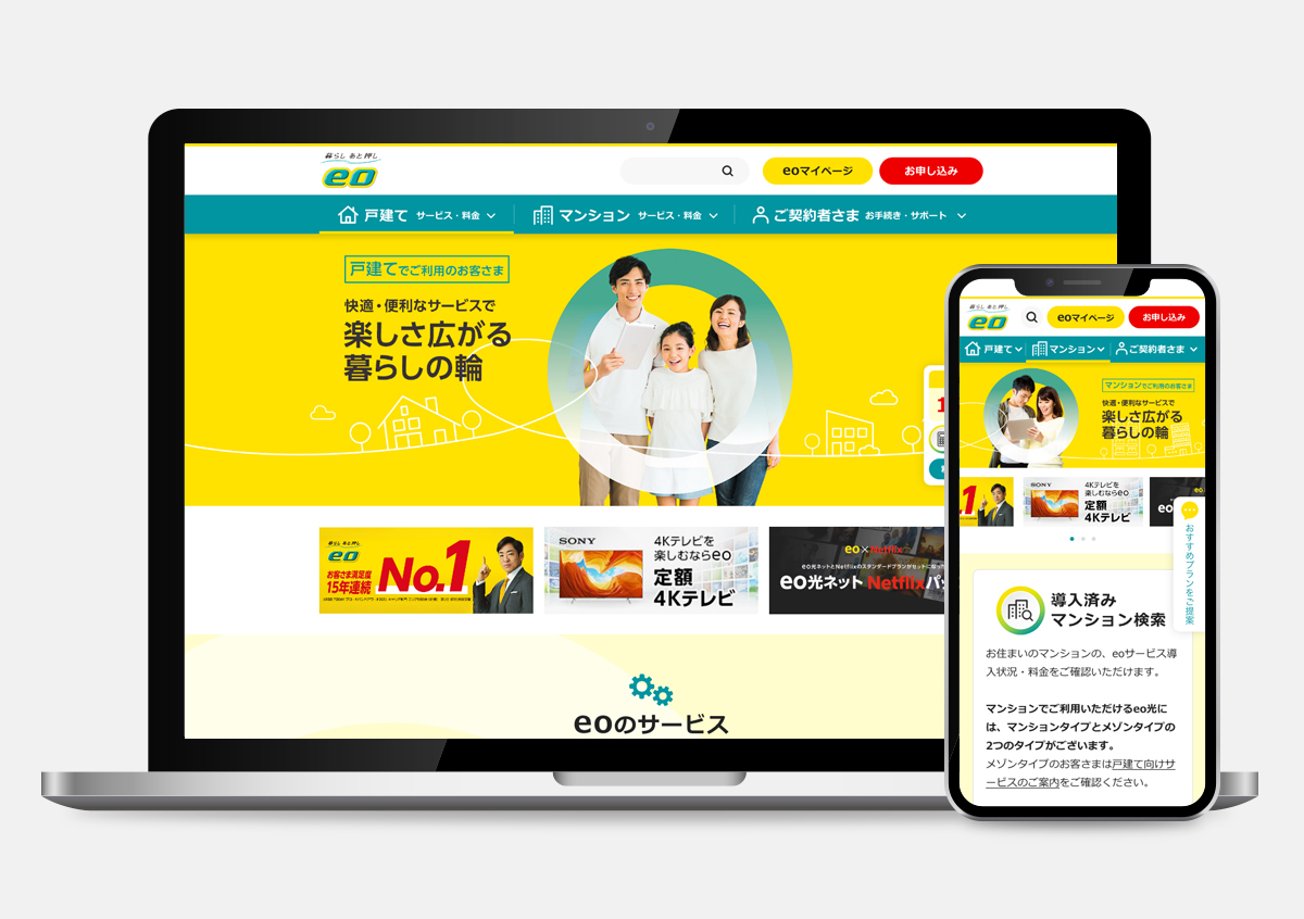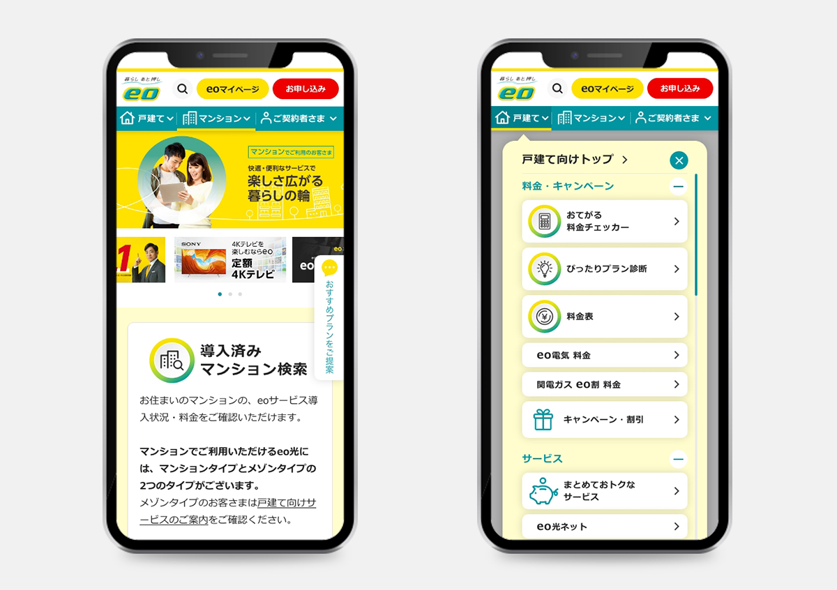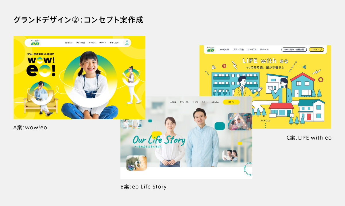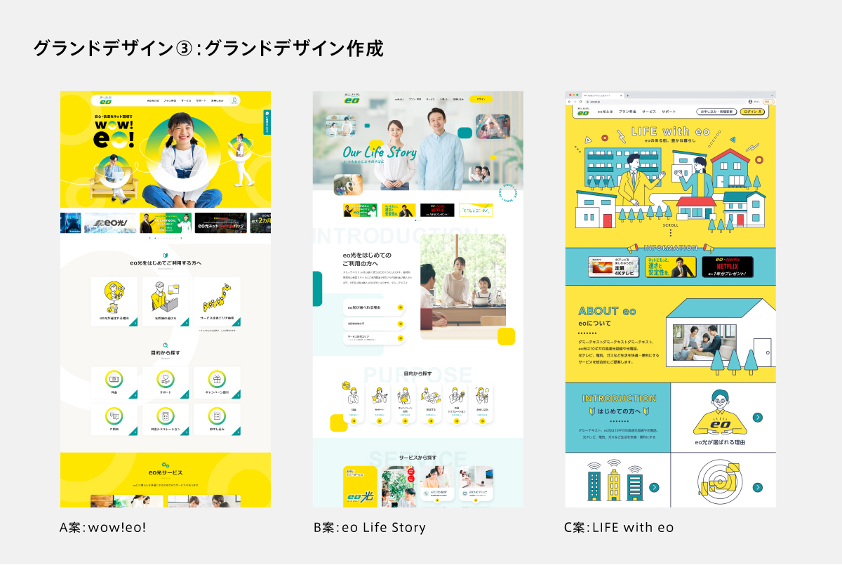 情報設計は、戸建サイトとマンションサイトの2サイト構成にし、グローバルナビゲーションやコンテンツエリアにおける要素は基本的に新規検討ユーザー向けを有線して構成。(既存ユーザー向け機能の導線は専用メニューで担保)また、eoブランドイメージを踏まえて、デザインのコンセプトやデザインを明確にするために、しっかりとグランドデザインを定義し、WEBデザイン作成がスムーズに進行できるように行いました。