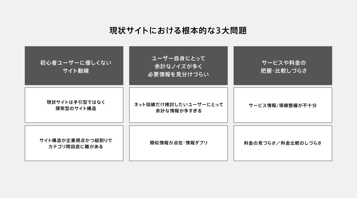現行サイトには根本的な問題があり、ユーザー起点での導線・コンテンツ整備不十分。またコロナ禍により低リテラシー層のサイト流入も増加している中、ユーザー自身で必要な情報をスムーズに得ることができ、コンバージョンや他チャネルへの送客を強化するためには全体の抜本的な見直しが必要となりました。