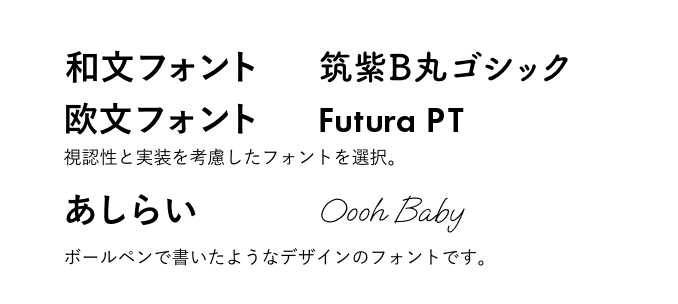 ・ロゴとの親和性と可読性を考慮し、和文欧文ともに読みやすいゴシック体にしました。 また、あしらいのフォントにボールペンで書いたような筆記体(Oooh Baby)を入れて、ビジネスや学習のイメージを表現しました。
