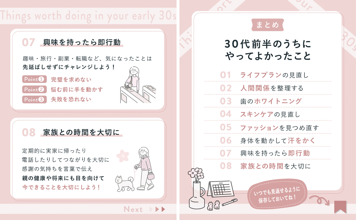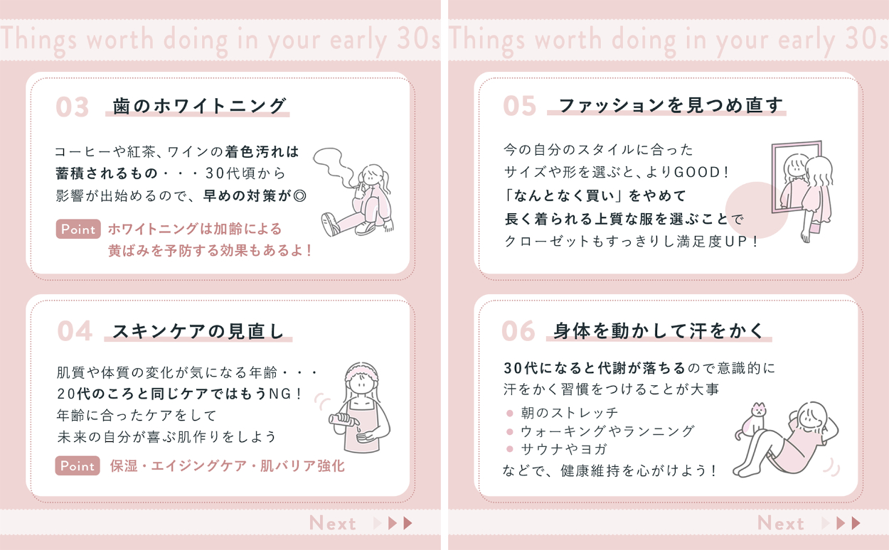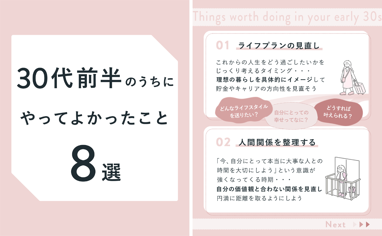 「30代前半のうちにやってよかったこと8選」のInstagram投稿画像5枚制作(表紙含まない)