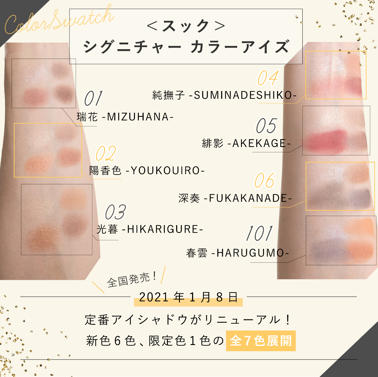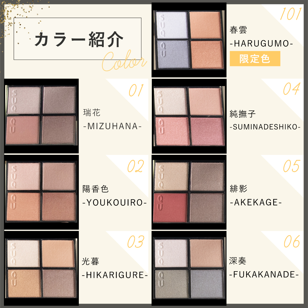 SUQQUブランドの洗練されていて大人っぽいイメージに合わせるため、透過度を下げた黒とゴールドラメを配置。メインカラーは黒を多用すると重くなりすぎるため、ゴールドとなじむ黄色を選択して統一感が出るようにしました。
