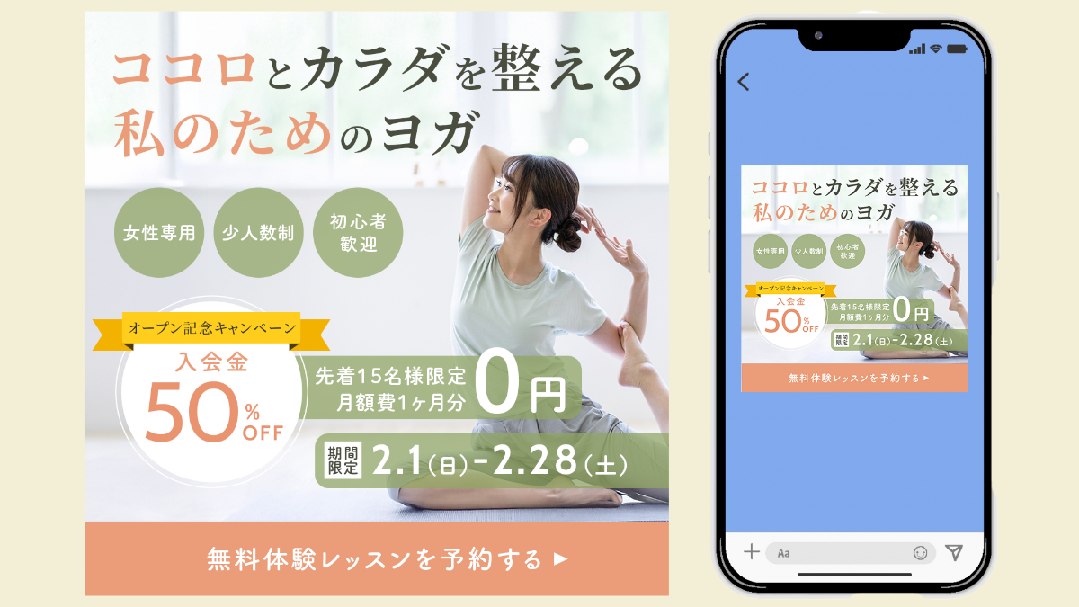 架空のスポーツジム経営会社の公式LINEアカウントにて、新規ヨガスクールの初回体験レッスンのお知らせメッセージバナーを制作しました。
