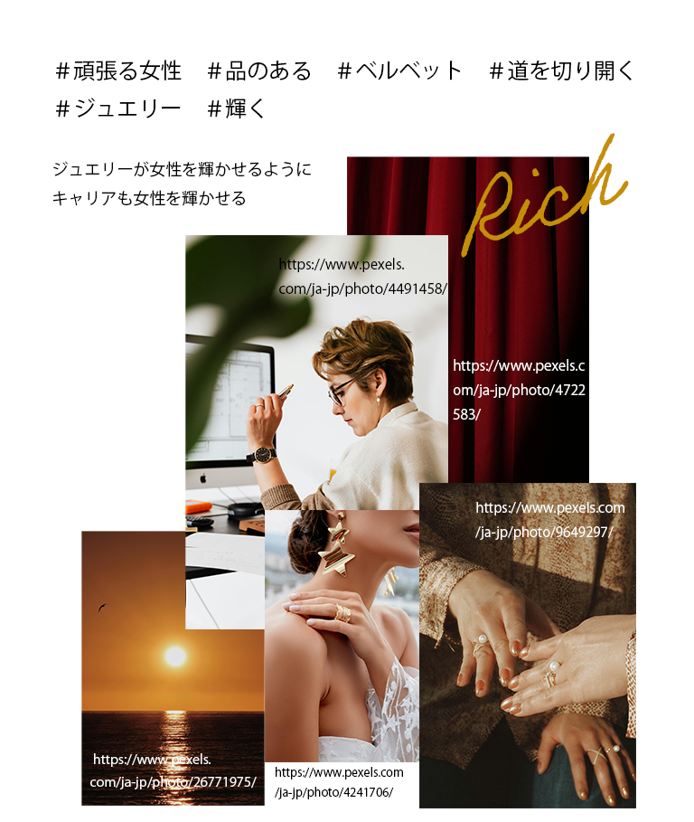 私はこの女性はとても輝いていると感じ、ジュエリーとキャリアをかけ、「ジュエリーが女性を輝かせるように キャリアも女性を輝かせる」というテーマを元にムードボードを作成しました。