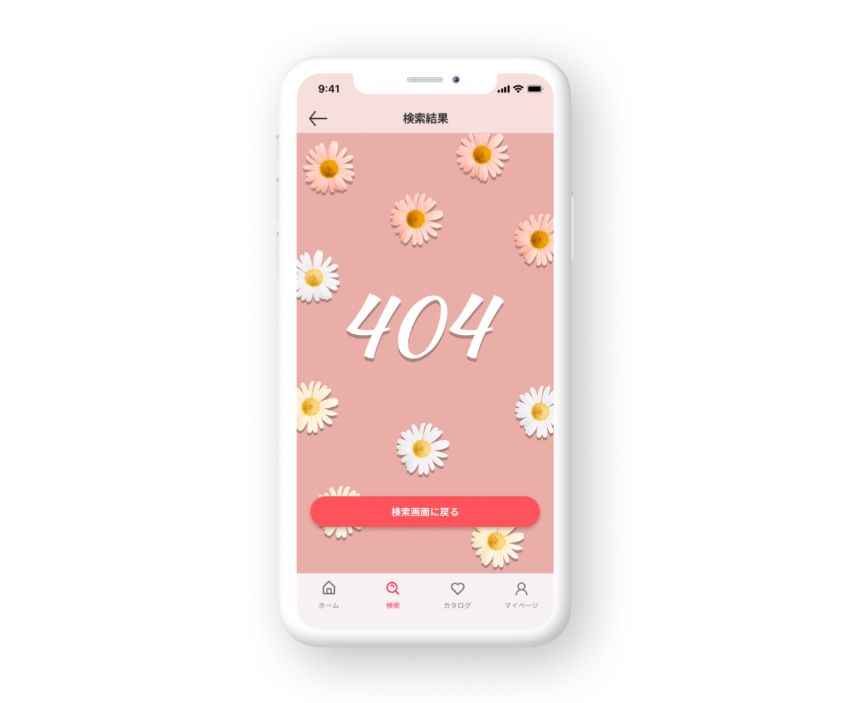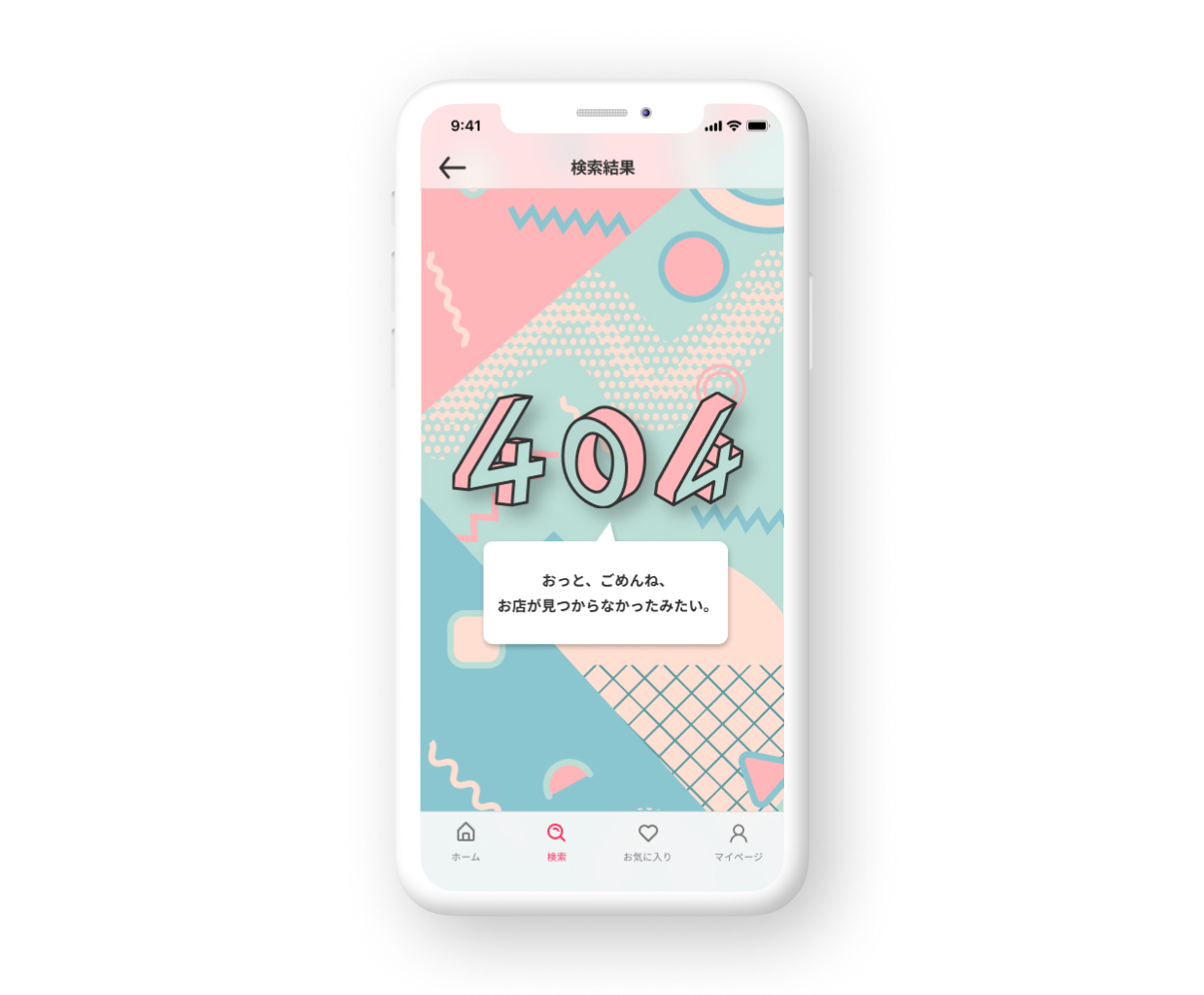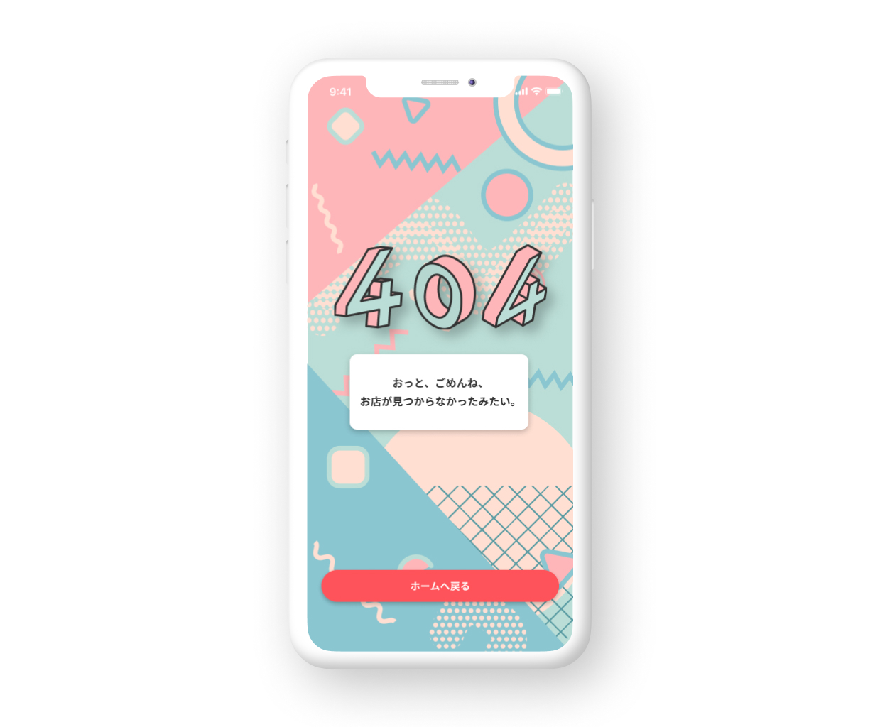 普段404デザインはアプリでは滅多に見ることはないのですが、このように404エラーページもデザインに拘って作成されていると、目的の画面が表示されなかった場合のイライラなどが軽減されると思いました。