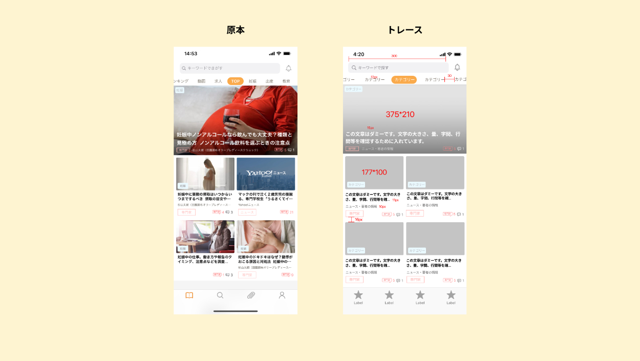 また、キズナのアプリのフィード画面をトレースしてみました。
