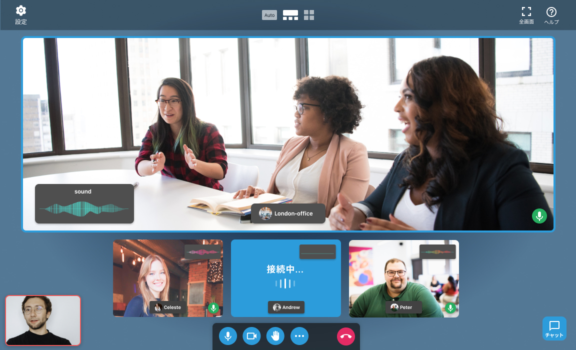 下のメニューには会議の途中で手があげれるように挙手✋ボタンを付けました。