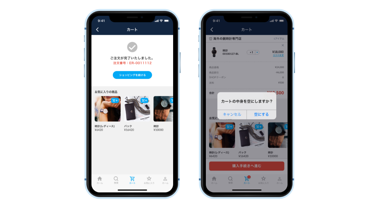 今回、カートが空の場合、カートに商品が入った場合、商品を削除する場合、カートから決済が完了した場合の画面を作成しました。
