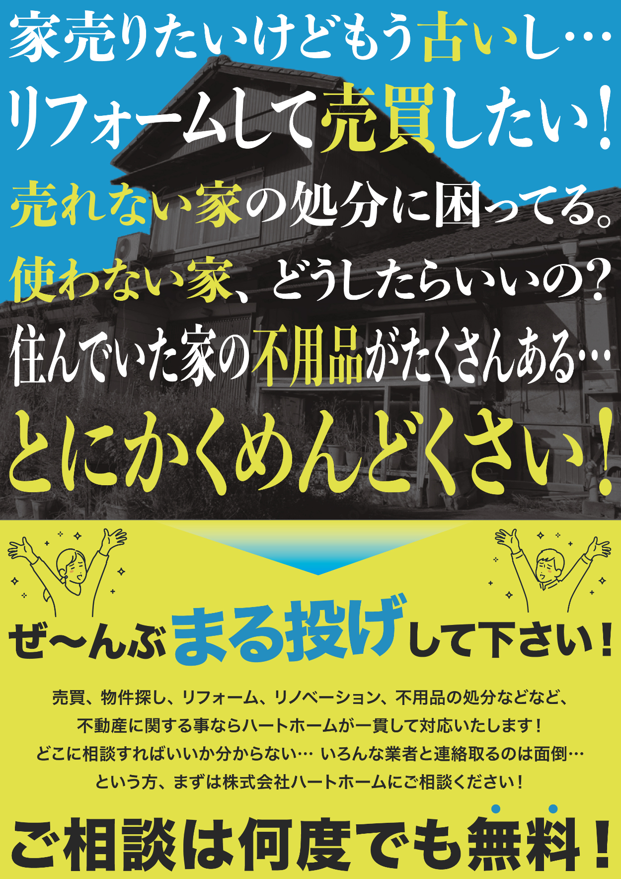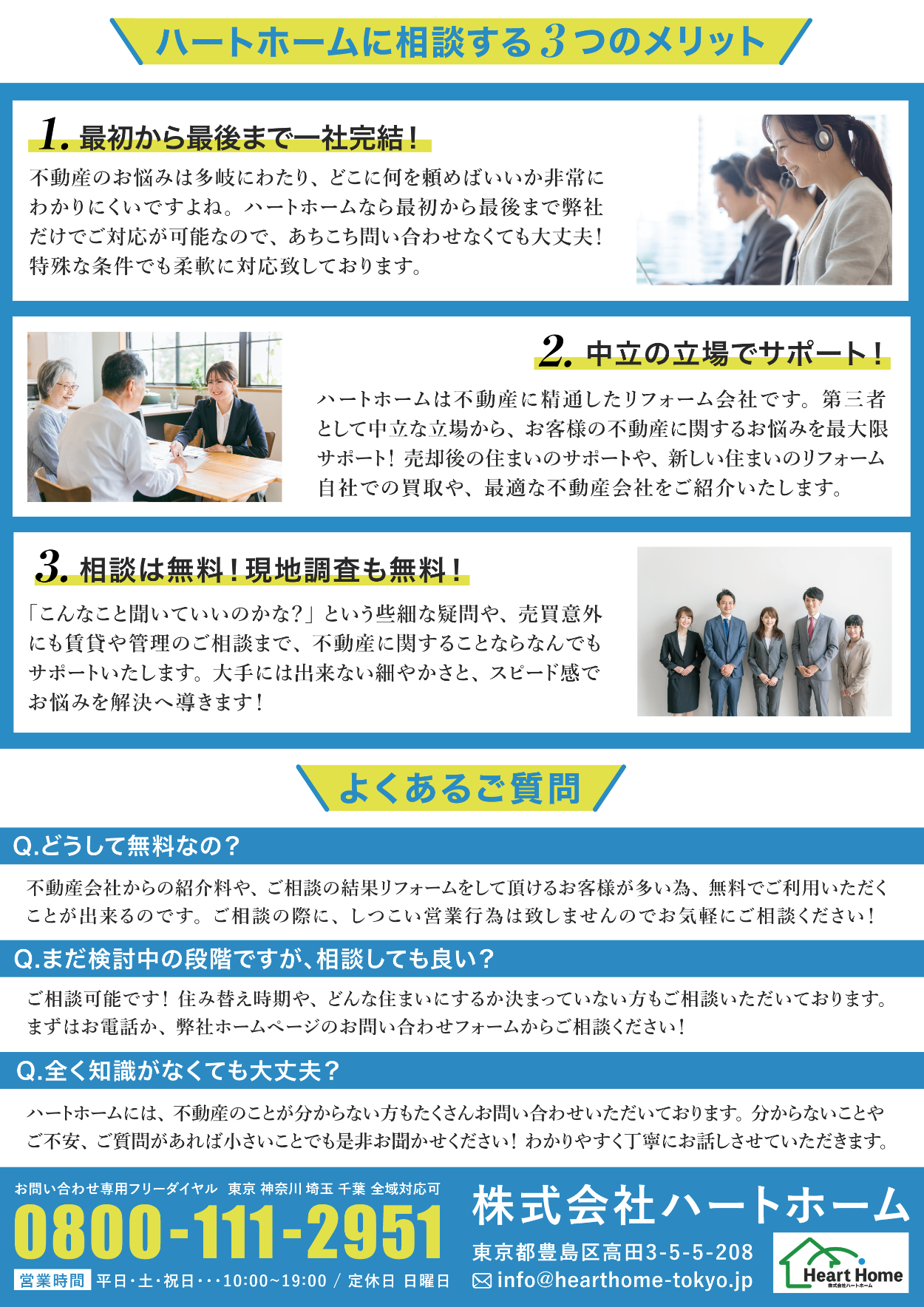 「建物の ”処分・売買・リフォーム” を一貫して対応できる事をアピールした、インパクトのあるチラシを作って欲しい」という事で作成したチラシです。ライティング、デザイン担当。