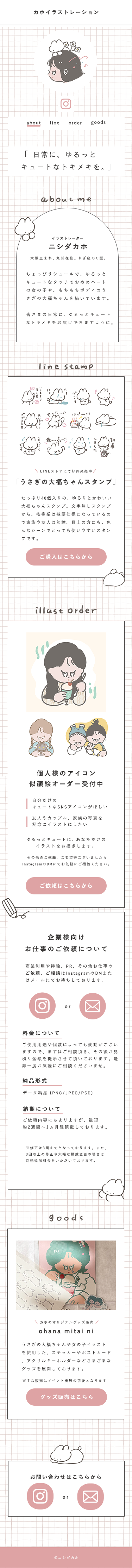 イラストレーターニシダカホのInstagramから、LINEスタンプやグッズ販売などの各コンテンツへ飛べる+企業様やフォロワー様にイラストの世界観なども伝えれるリンクサイト。