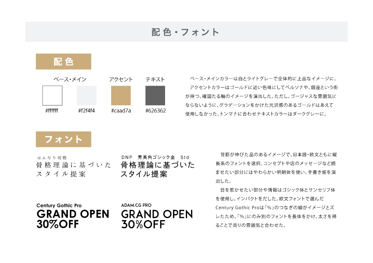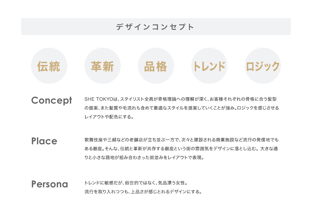 上記の要件定義をもとに、ペルソナを設定し、デザインコンセプト・配色・フォントを考えました。特に、今回は拠点である銀座という場所に関しても意識して情報設計に取り組みました。