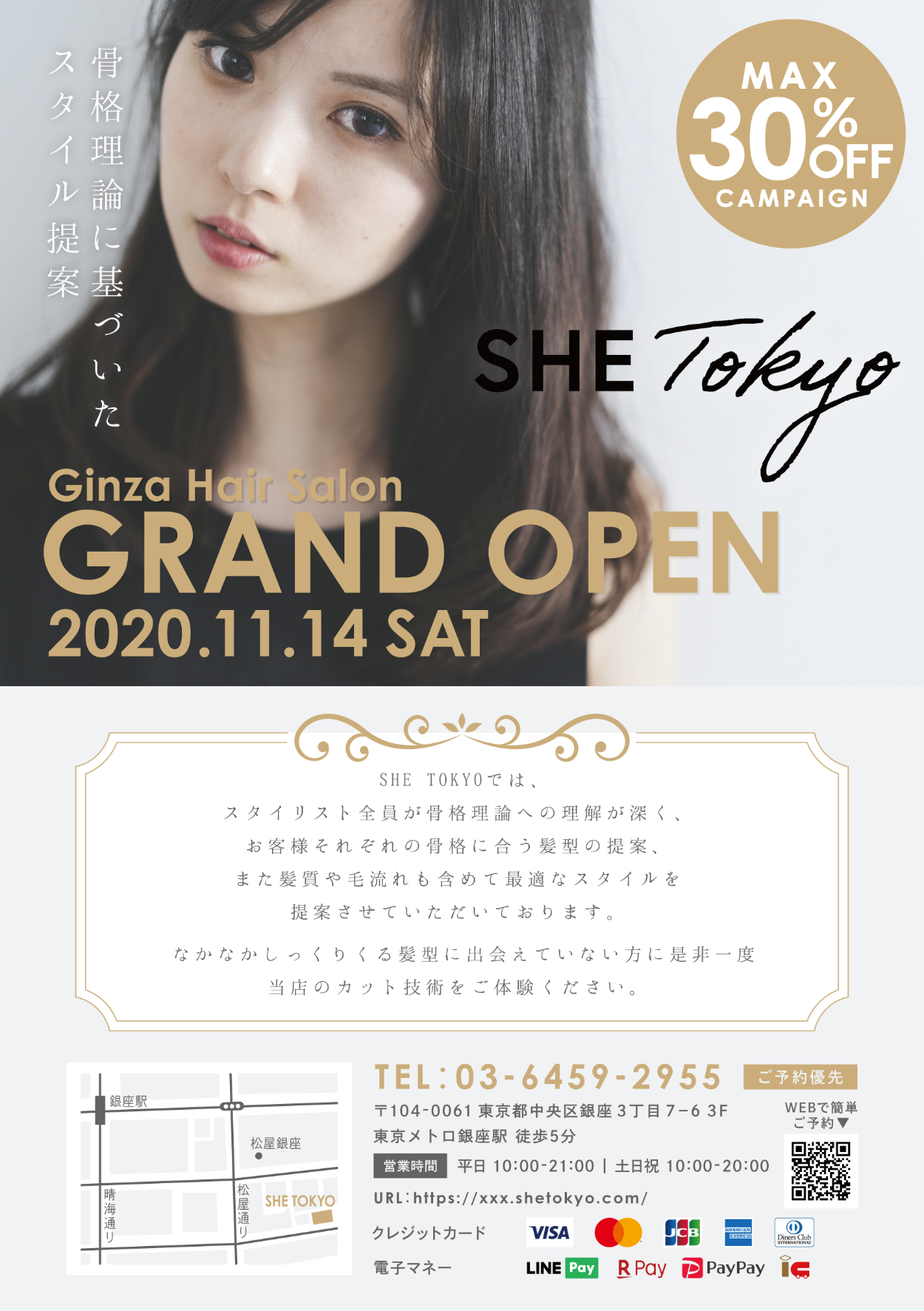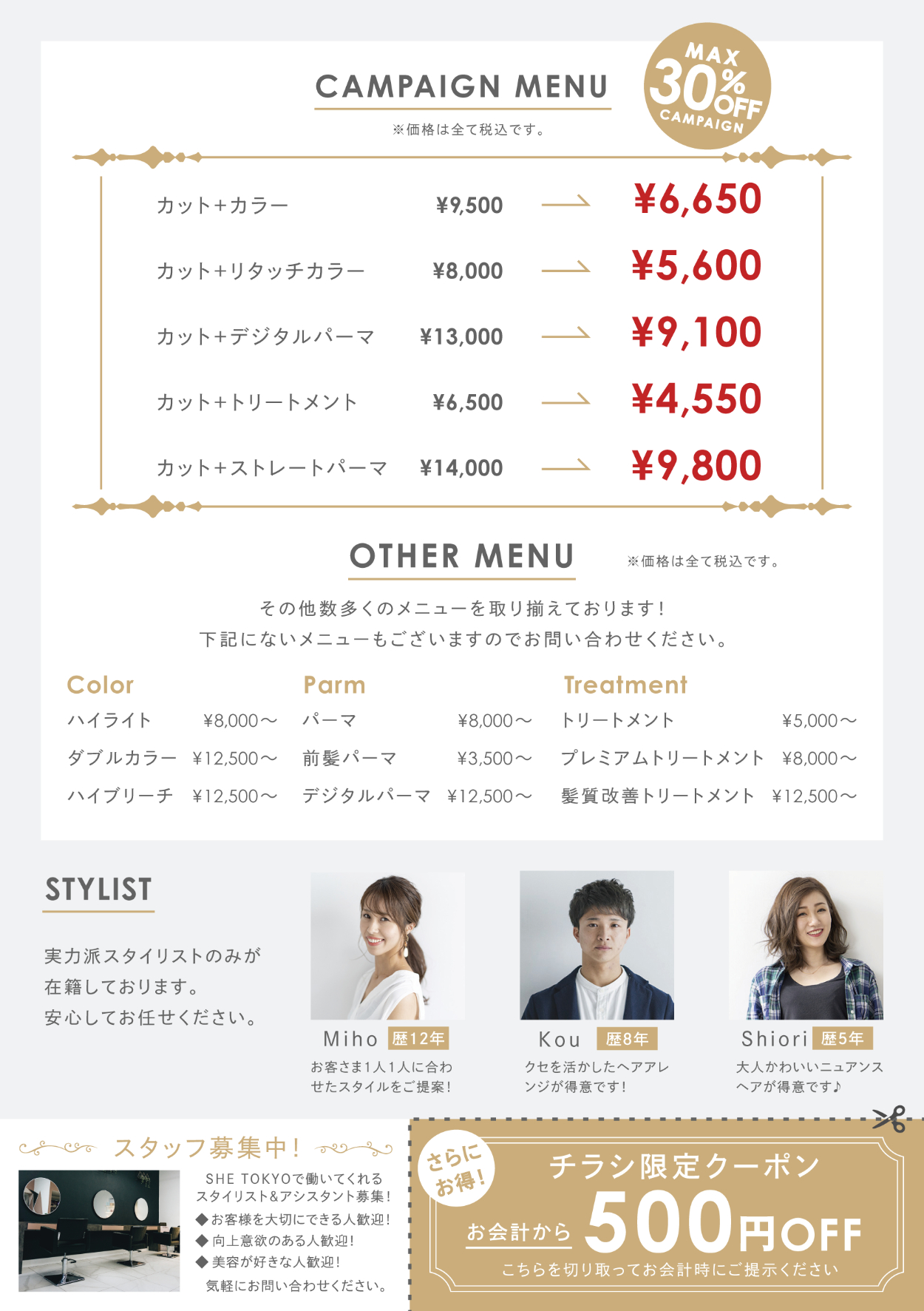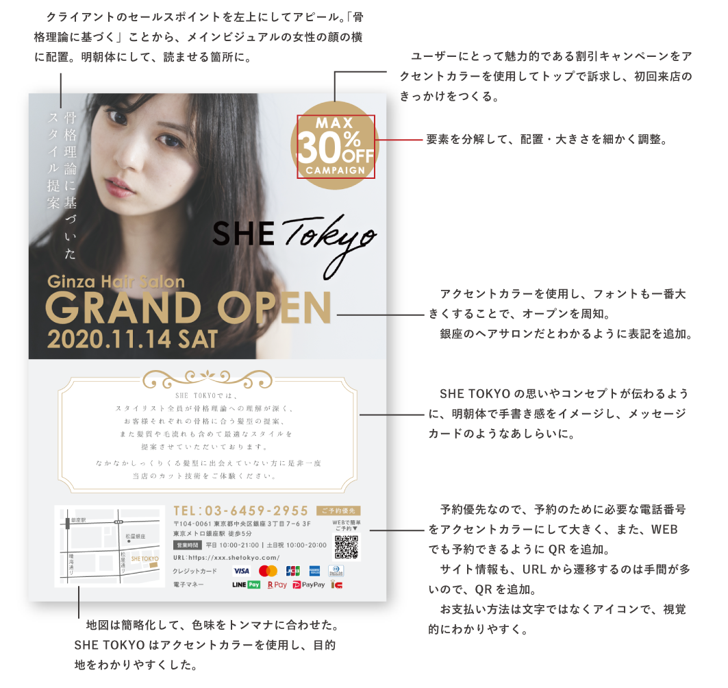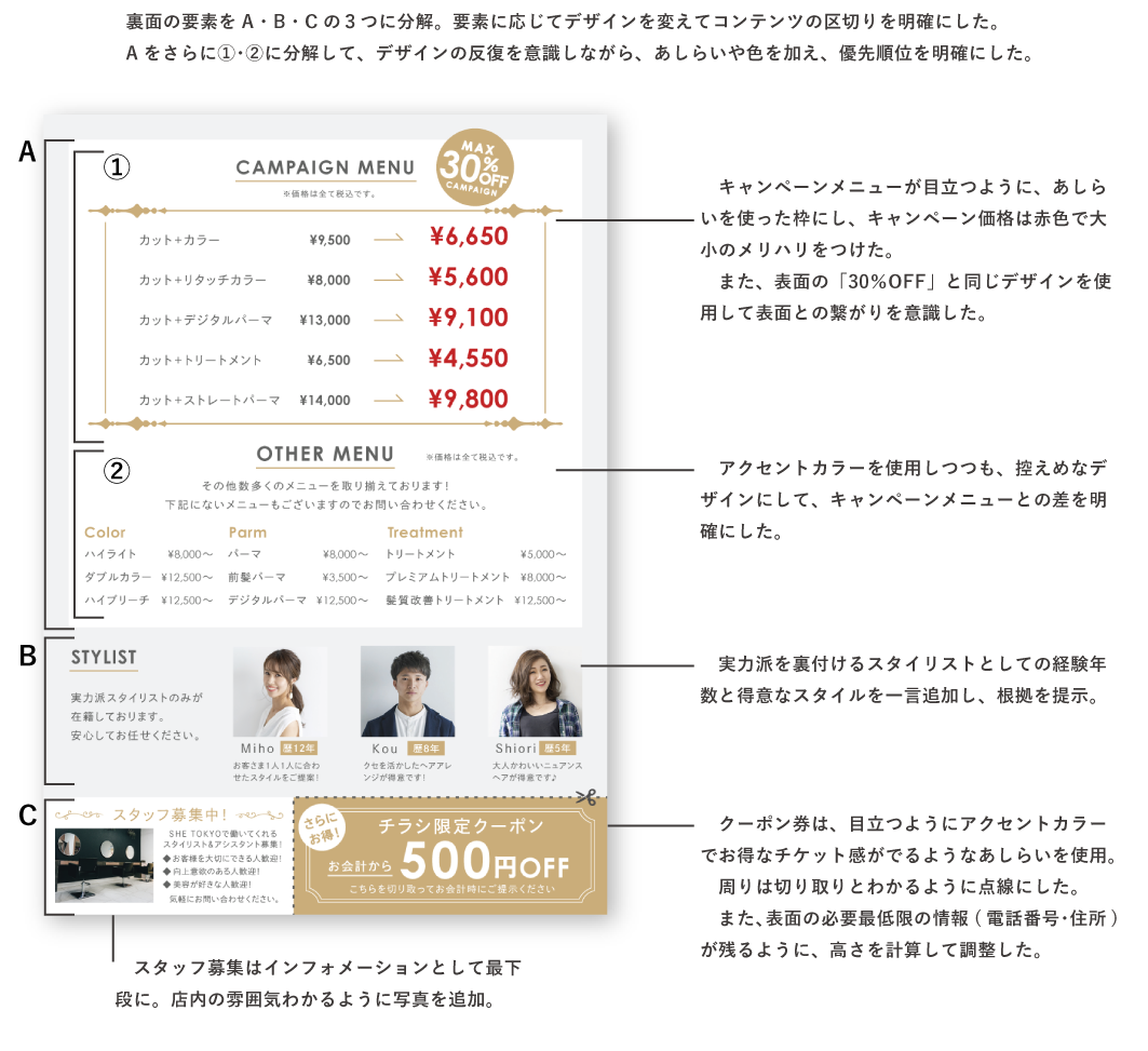 SHElikes MULTI CREATOR COURSE 7つ目の課題 フライヤー制作です。 架空の美容室のオープンチラシのデザインを作成しました。 [制作時間:12時間 / 制作期間:1週間/使用ツール:Illustrator]