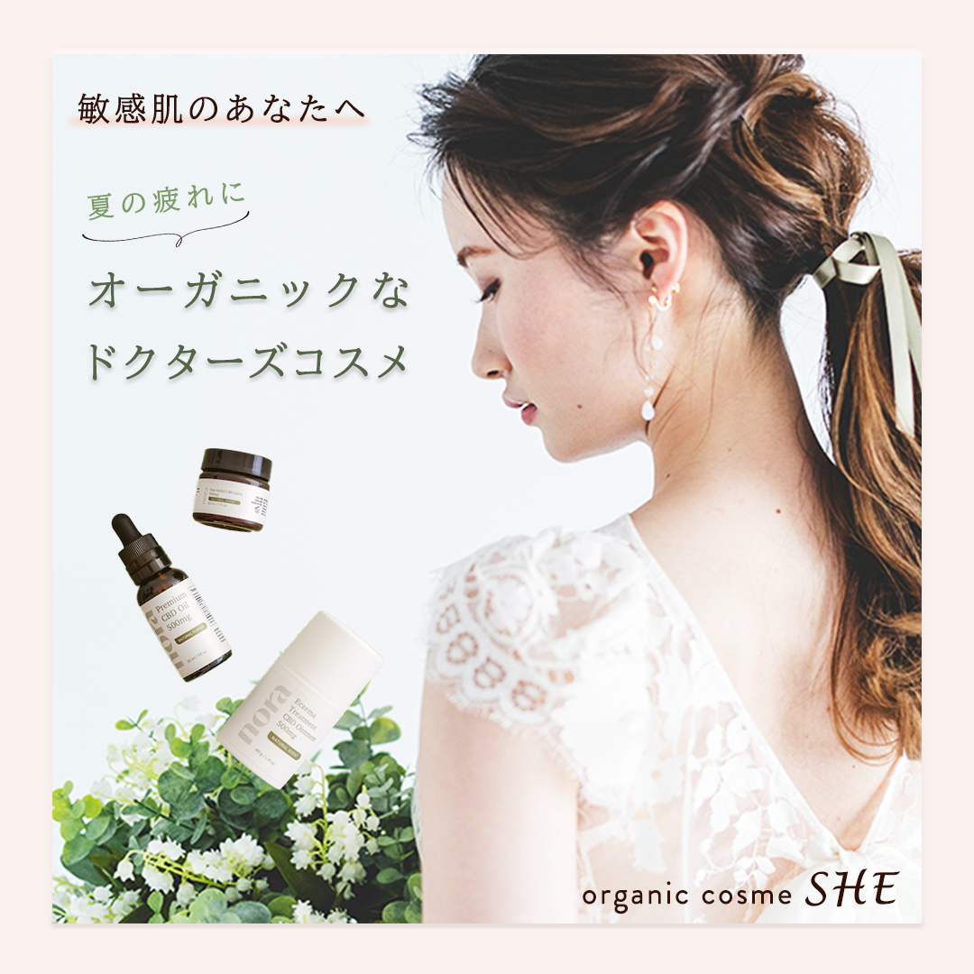 - 「オーガニックコスメSHE」の部分は、英字のロゴ風にして、おしゃれな印象をもってもらえるように工夫しました。