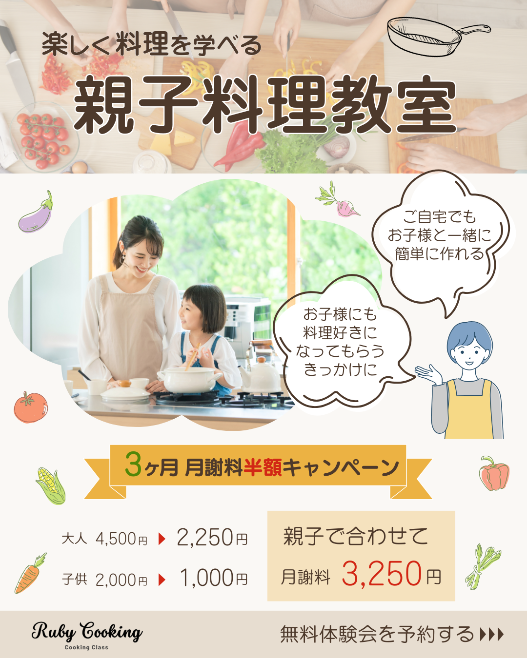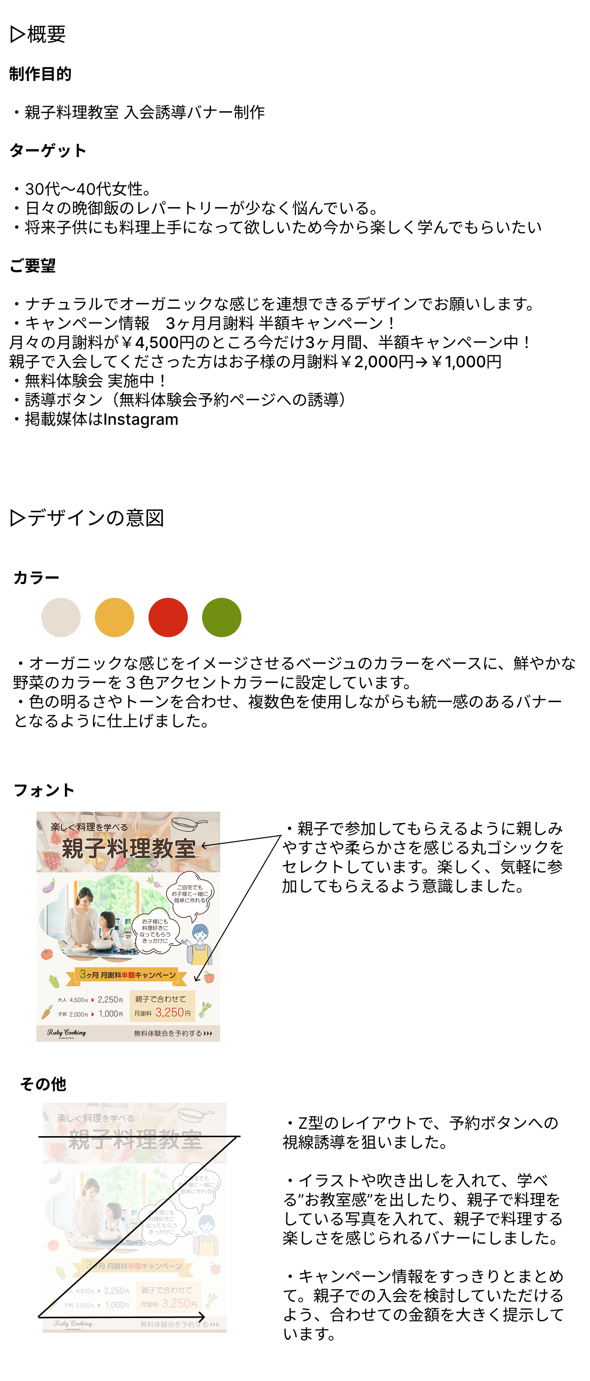 [架空案件] 親子料理教室 加入誘導バナー Chihiro.H Webデザイナー OVERVIEW Webデザインスクール「HerTech」様の勉強会で作成したInstagram用のバナーです。 YEAR 2025 ▷制作物サイズ:1080px × 1350px使用ツール:Canva