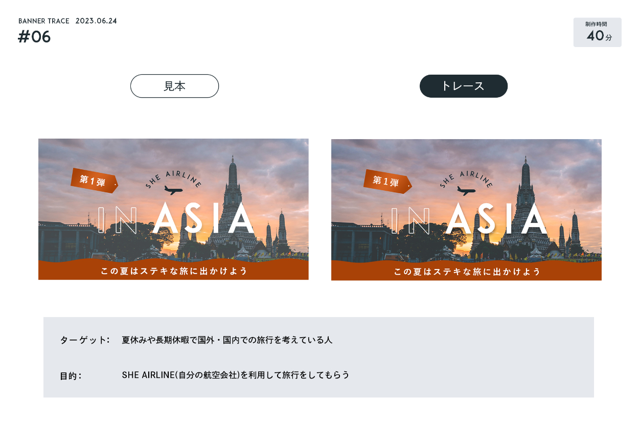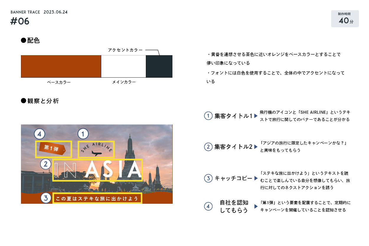 SHE likesの制作課題として、バナートレースに取り組みました。 「ターゲット」「目的」「配色」「視線誘導」の分析結果もまとめています。 [制作時間:40分/まとめ30分/使用ツール:Photoshop]