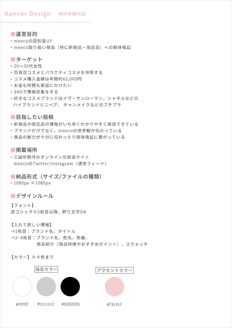 【実績】三越伊勢丹meeco様 SNS投稿バナー MIYU Webデザイナー OVERVIEW Instagram/Twitter投稿用バナー制作 。制作時間:4時間 YEAR 2021 掲載サイト✴︎【Twitter】こちら【Instagram】こちら◇制作物◇制作内容◇工夫したところ1.情報整理情報量が多いので、見やすいように情報整理を慎重にしました。また、目立たせたい部分には線を引いたり文字の太さを変えたりして工夫をしました。2.アクセントカラータイトルが「頬を染める春色デュオカラー」だったので、春らしいカラーをアクセントとして選択しました。3.余白余白を多めにとることで、情報量が多くても飽きが来ないように配置などを意識しました。