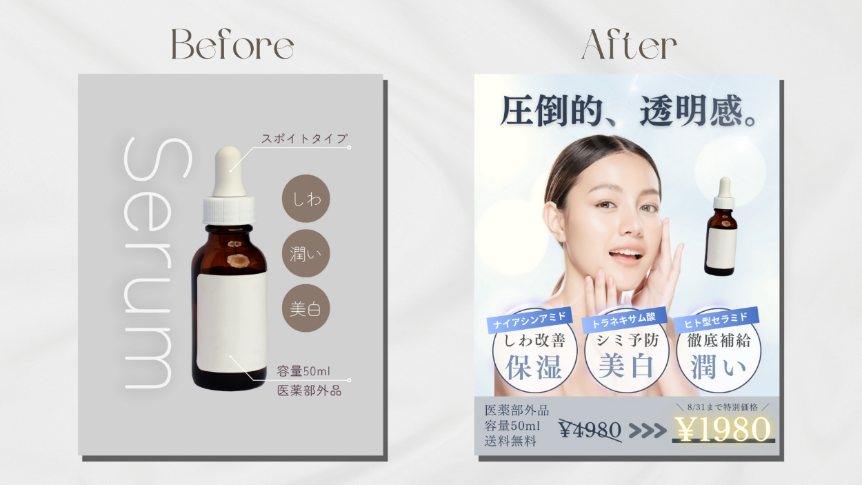 目立つよう掲載。美容液のイメージが付きやすくした。