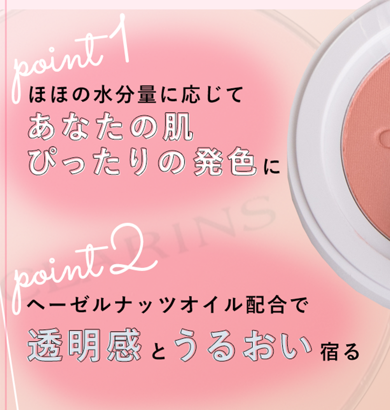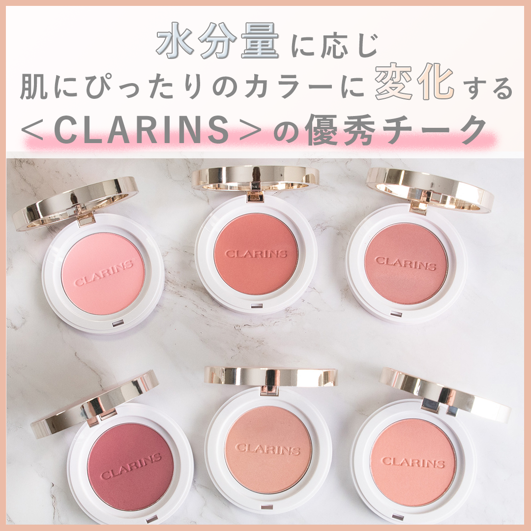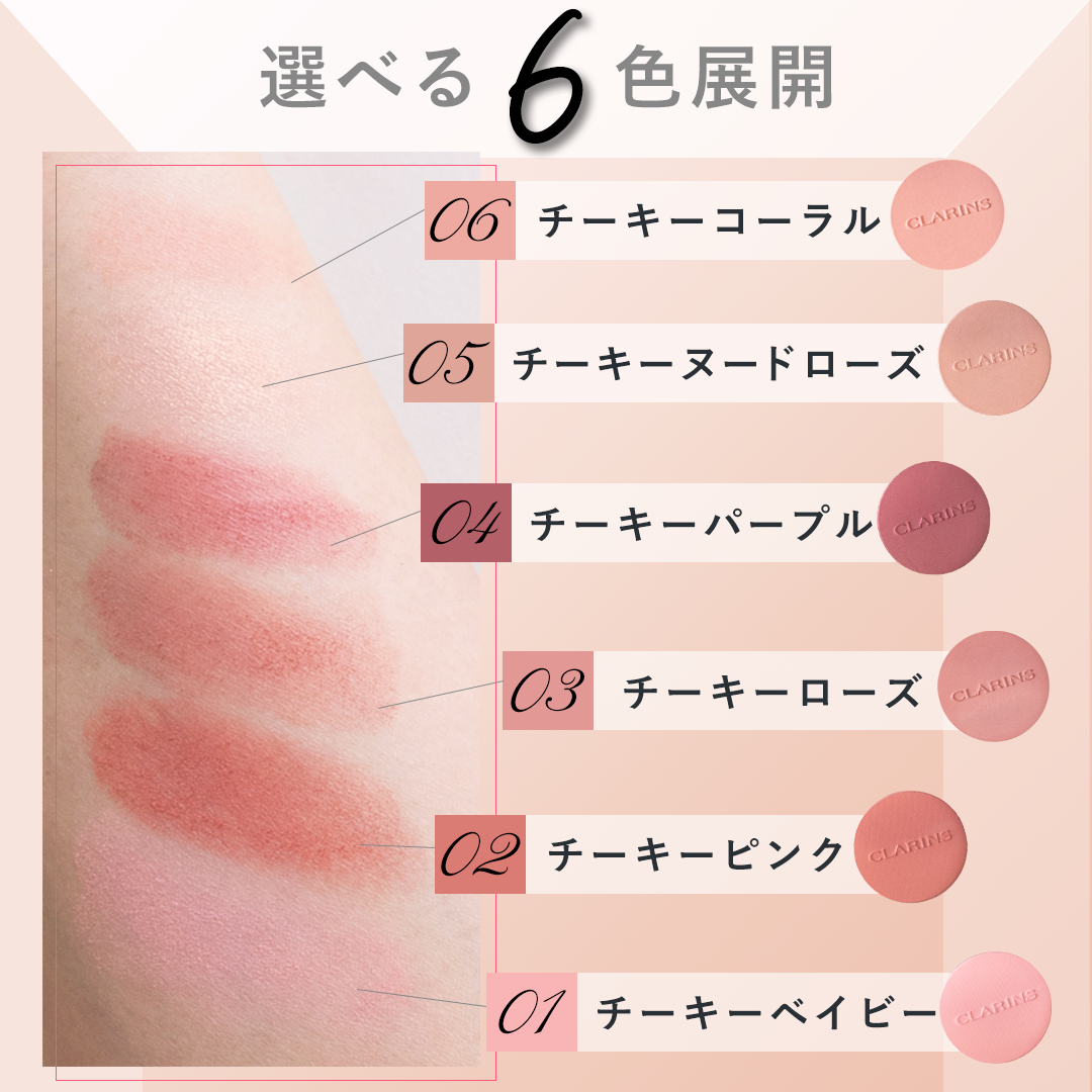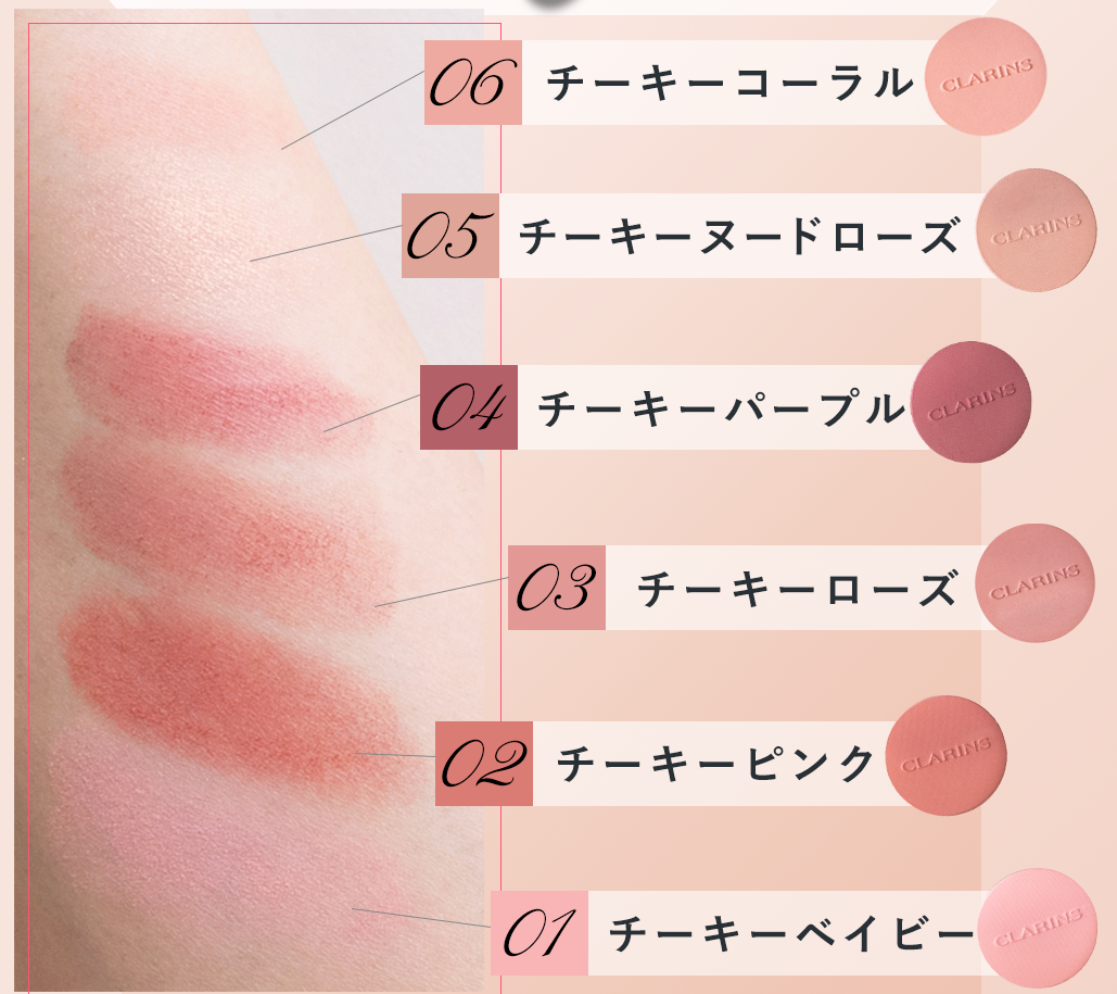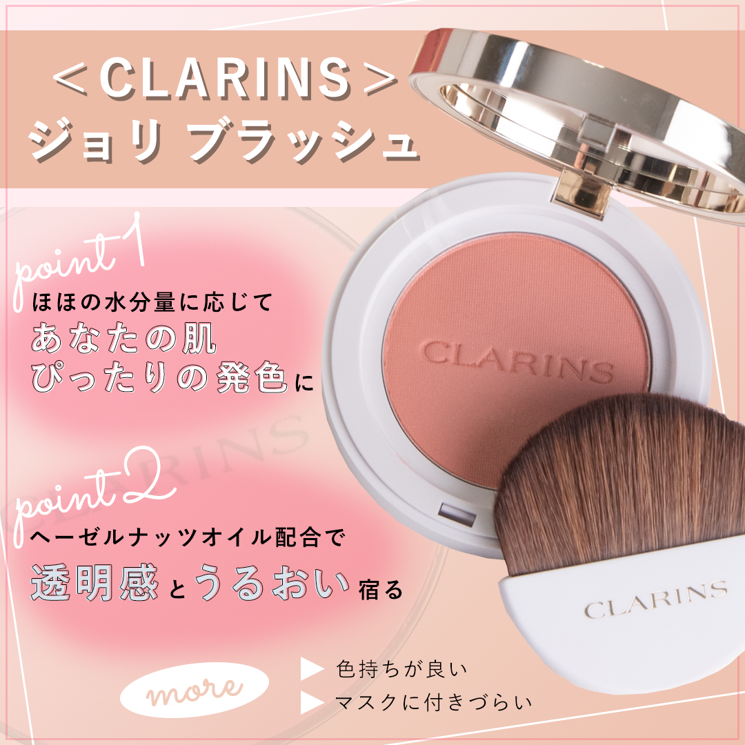 「<CLARINS>の優秀チーク」→ブラシでチークのふんわりとした質感を表現。