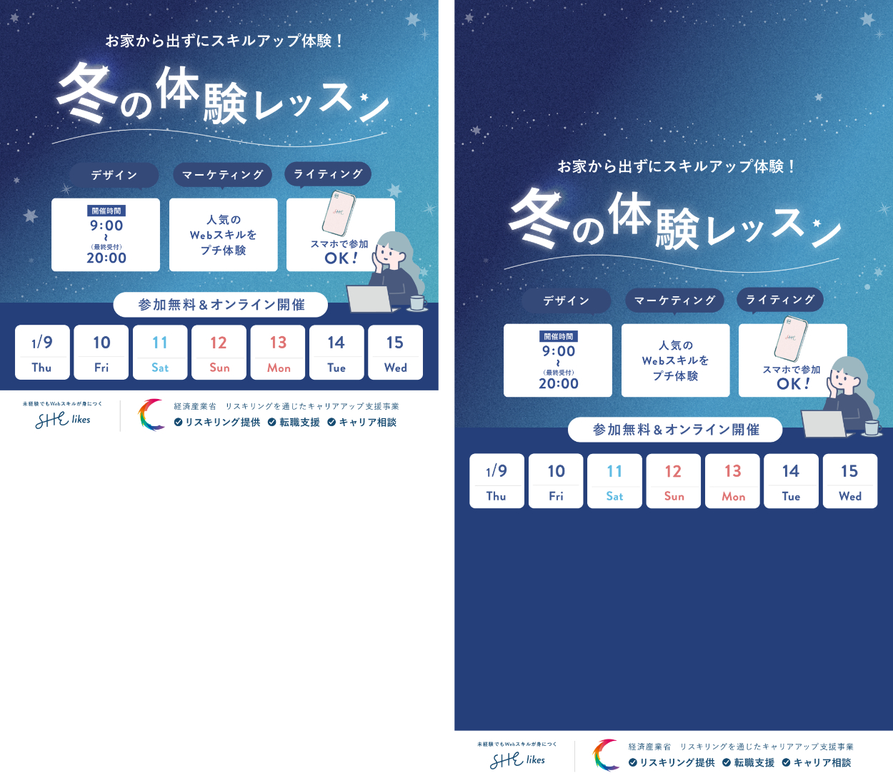 冬の季節感を視覚的に伝えるため、ブルーや雪を思わせるホワイトを基調に配色を工夫しました。また、雪の結晶や光のきらめきをあしらいに取り入れ、冬らしい雰囲気をやわらかく表現しました。