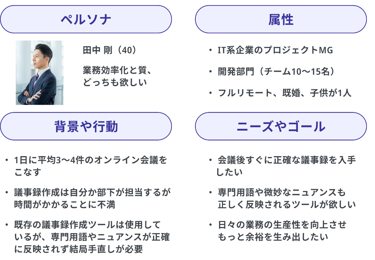 ※今回の商材は、想定ターゲットのニーズが明確(議事録作成の手間カット)なため、間接競合の分析は省略します。