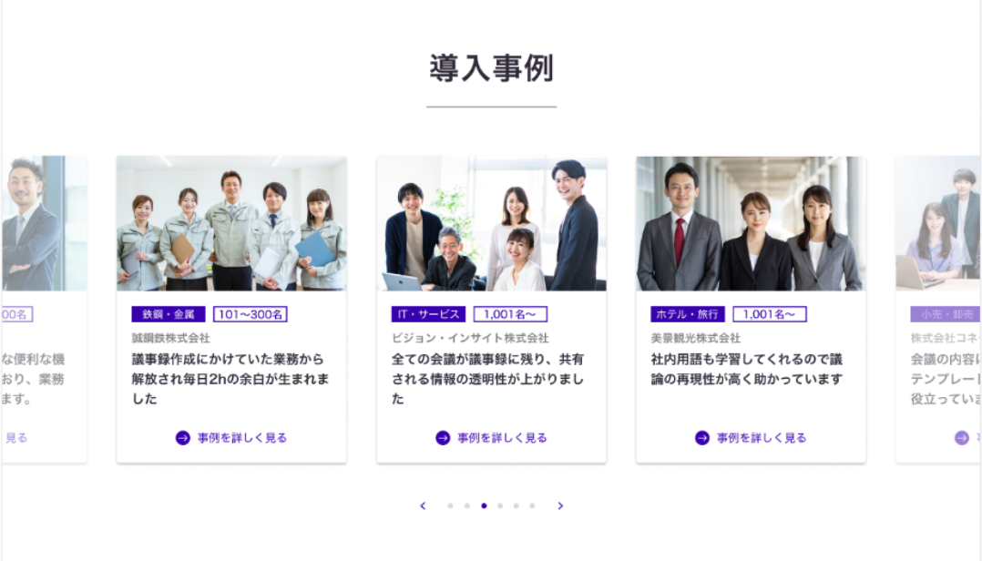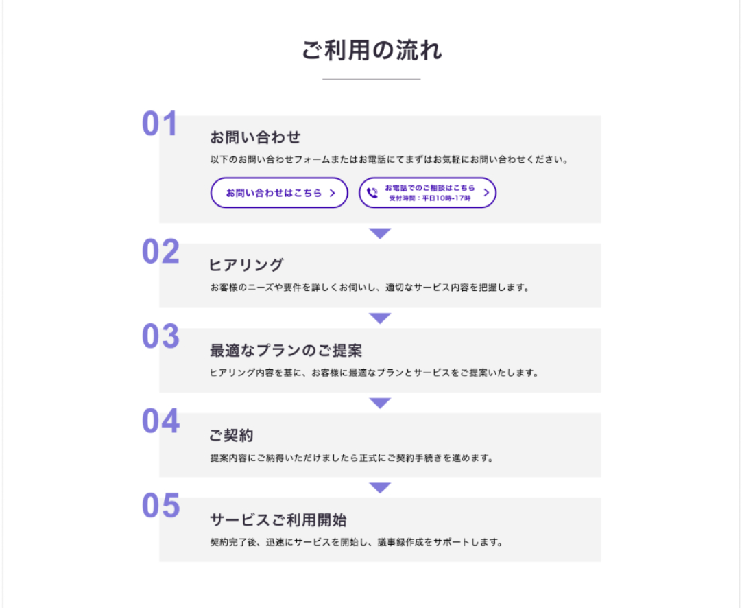 競合サービスサイトで使われていない紫をメインカラーにして、スタイリッシュで高品質な雰囲気が伝わるようにしました。