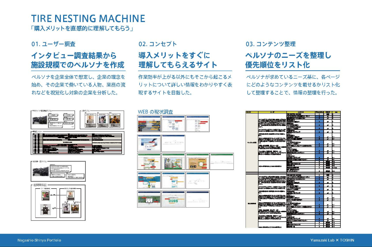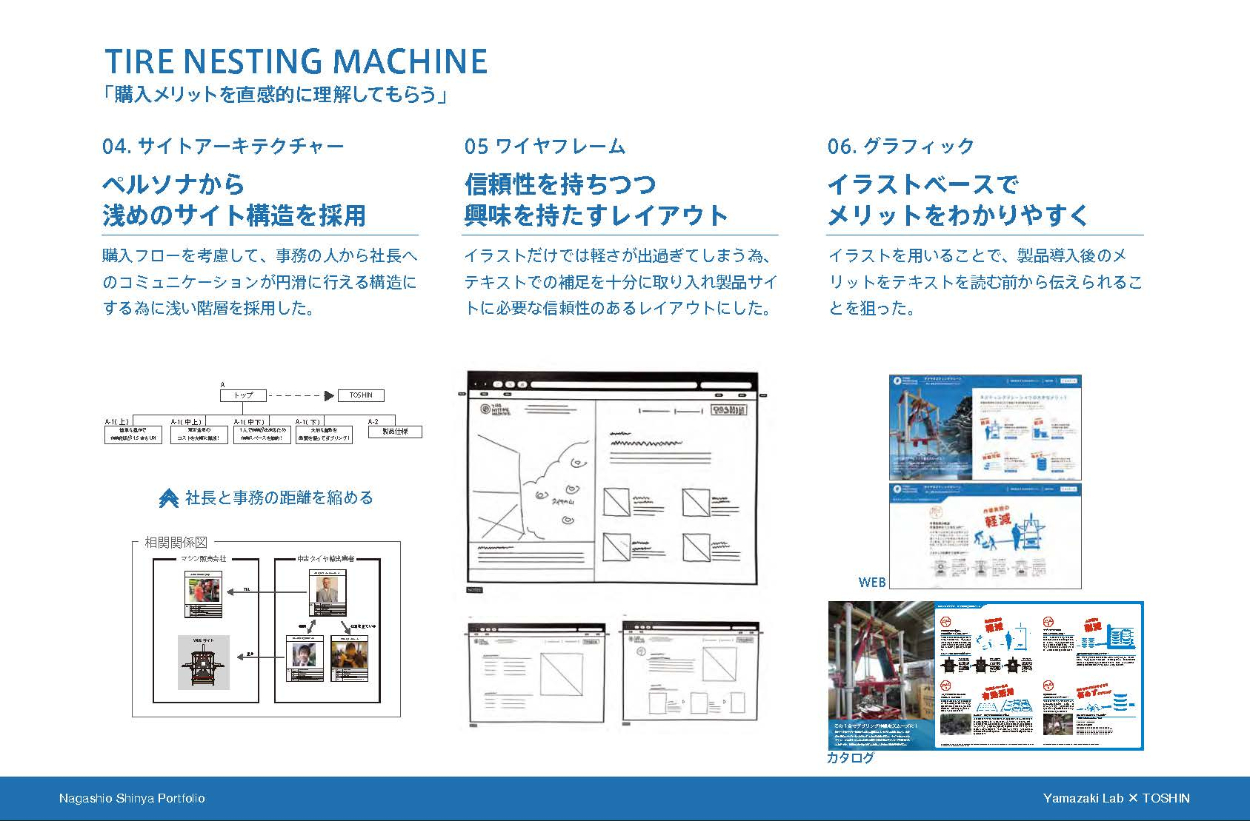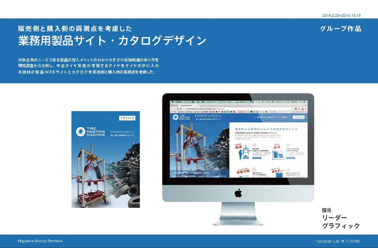 対象企業のニーズである製品導入メリットのわかりやすさや情報構造のあり方を現場調査から分析し、中古タイヤ業者が輸出効率向上のために使用する (タイヤをタイヤの中に入れる) 機械の製品WEBサイトとカタログを販売側と購入側の両視点を考慮して制作しました。