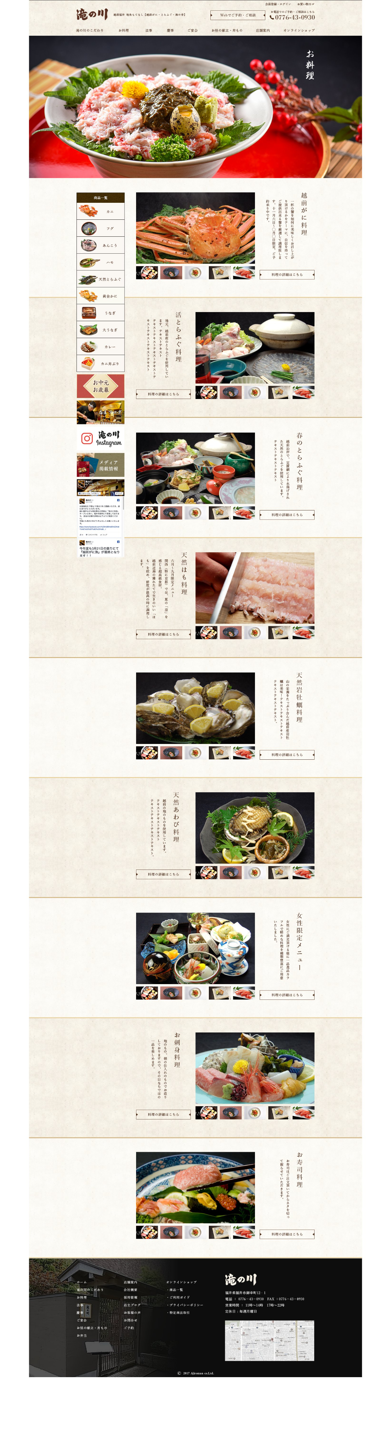 日本料亭 ホームページ - 滝の川様 ホームページ案作品の狙いや目的:集客アップためのホームページリニューアル案作品のコンセプトやポイント:上品で写真が引き立つ和風デザイン制作時間:25時間担当:デザイン