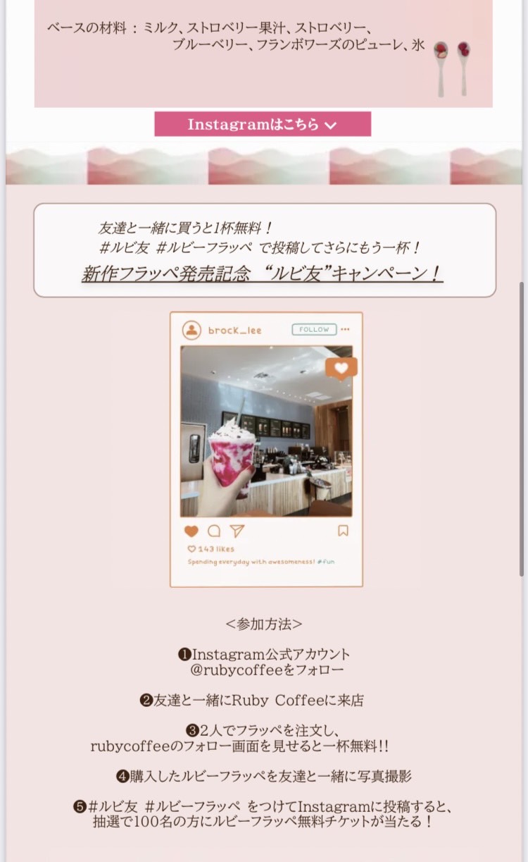 友達と一緒に買うと1杯無料!#ルビ友 #ルビーフラッペ で投稿してさらにもう一杯!