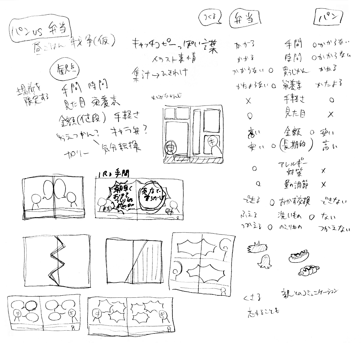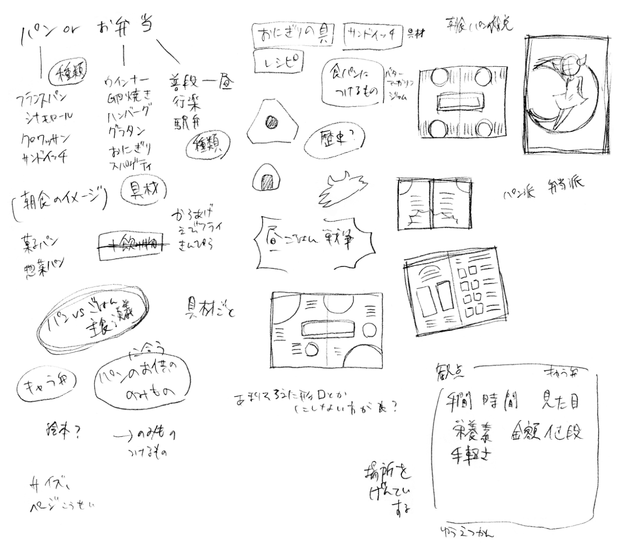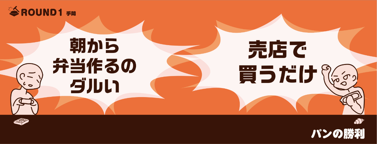 自分が「パン」「お弁当」と聞いたとき、真っ先に思いついたのが「昼ごはん」だった。昼食の「パン」と「お弁当」の違いを面白く見せたいと思い制作した。