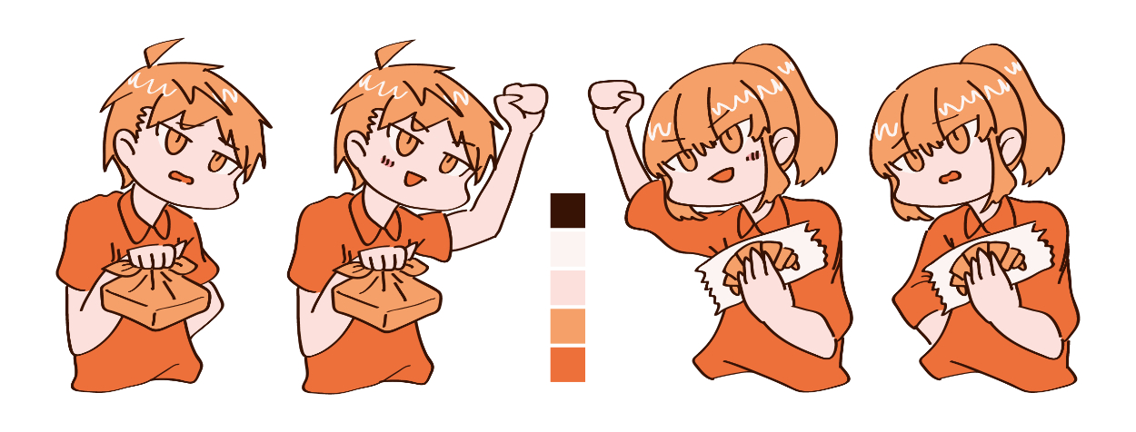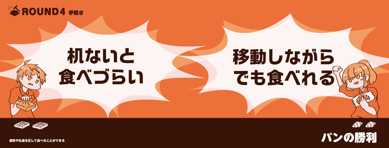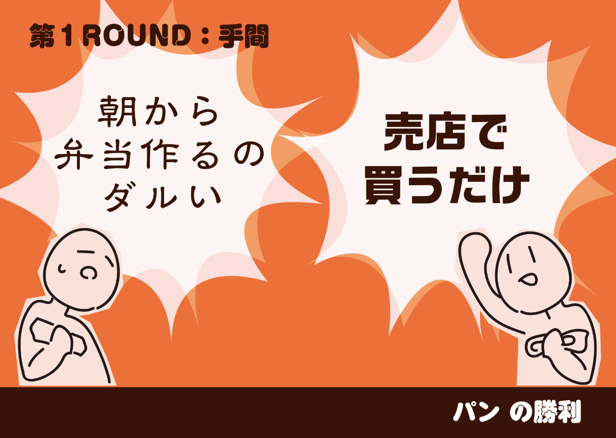 「パン派」の人と「お弁当派」の人が対立するイメージから、二人が対面する構図に決めた。題材が食べ物のため、元気の出る橙色を中心にデザインした。