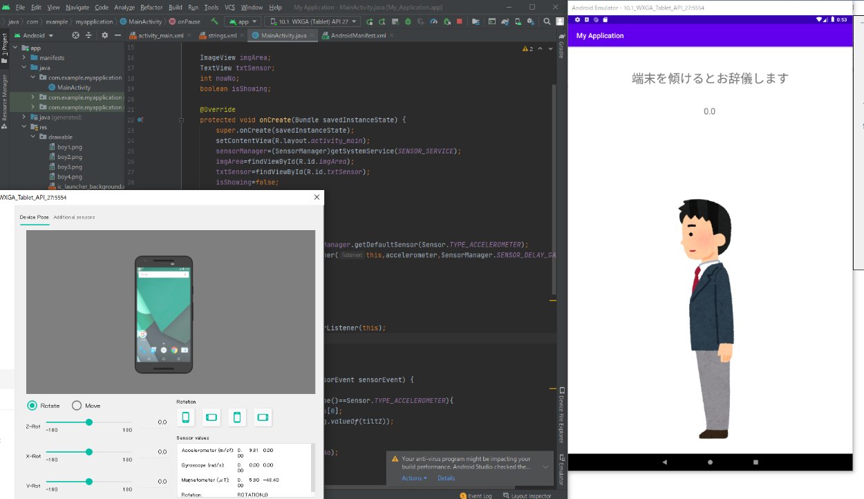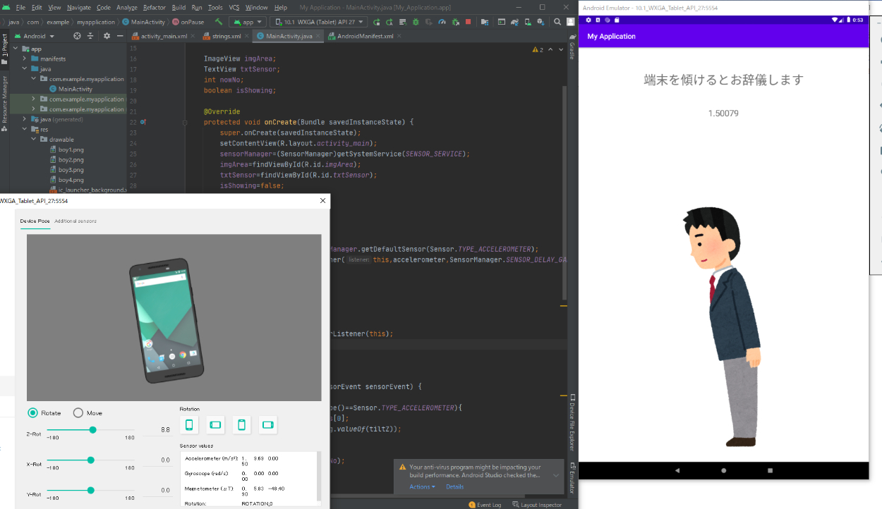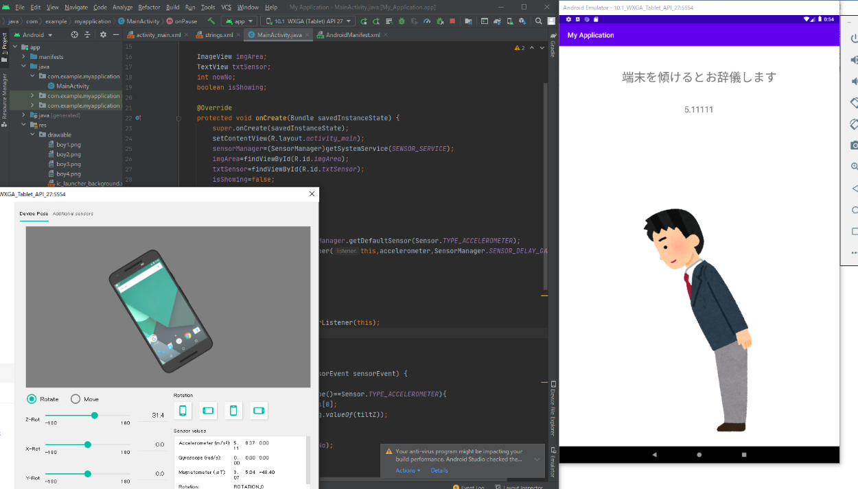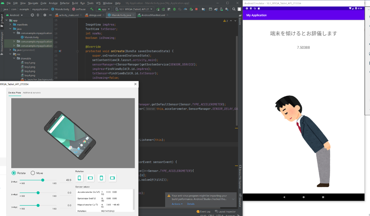 端末を傾けると加速度の値により画像が切り替わりお辞儀します