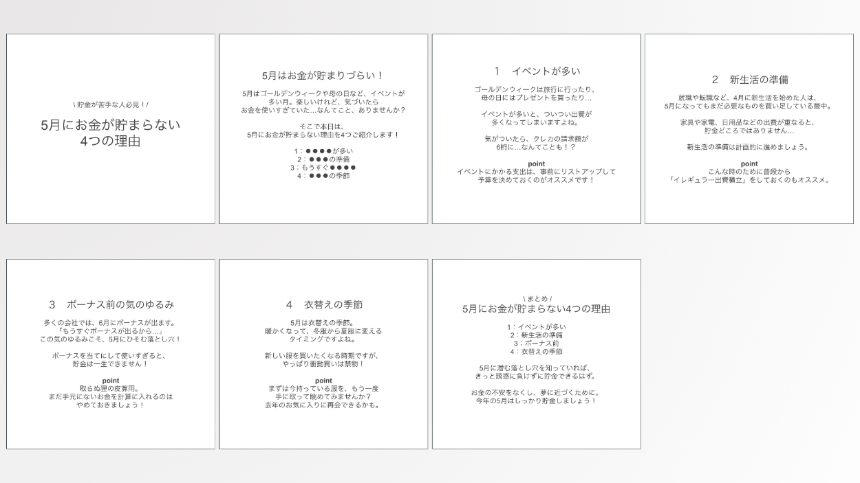 本クリエイティブはSHE SNSマーケティングコンペで採用された企画書を元に制作されたものです。企画を担当しました。(クリエイティブの制作は別の方が担当) 引用:SHEmoney公式Instagram(shemoney_jp)_5月にお金が貯まらない4つの理由