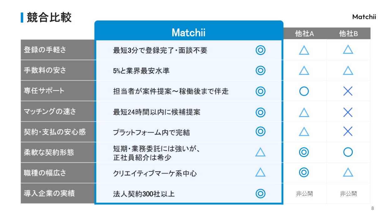 競合比較のページでは、自社の優位点を即座に把握できるようデザインしました。自社(Matchii)の列に太枠とキーカラーを施し、他社との違いを明確に強調しています。