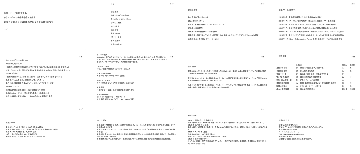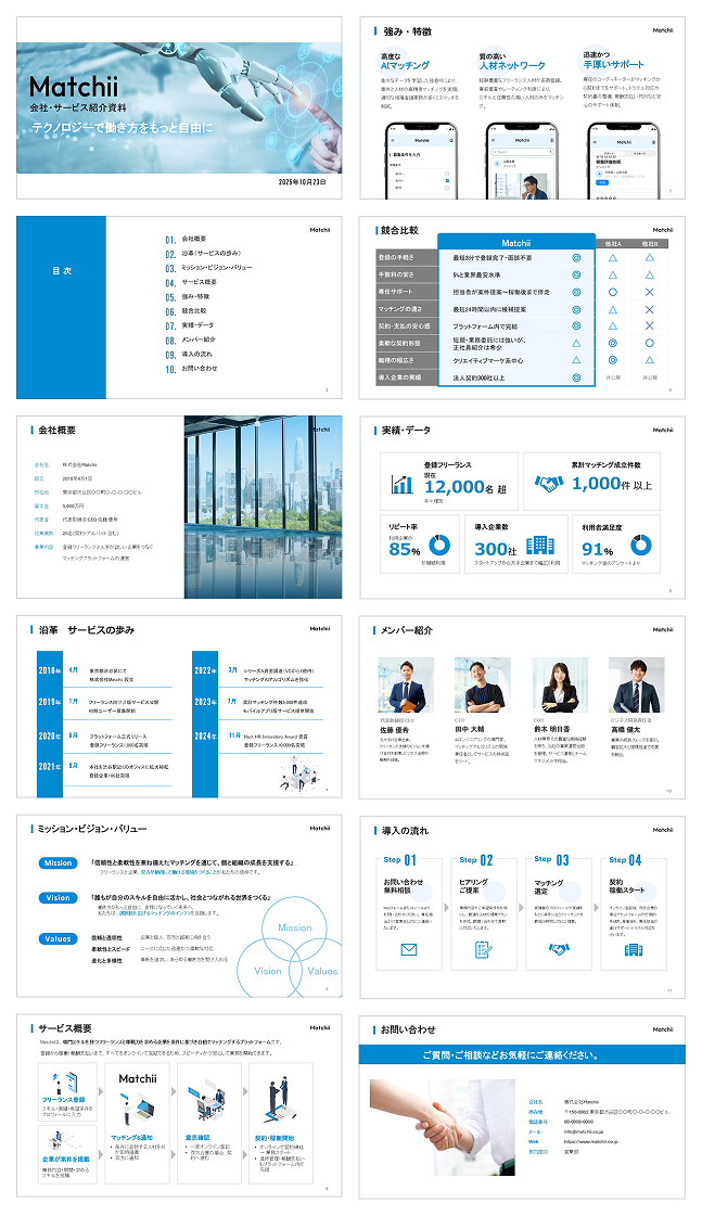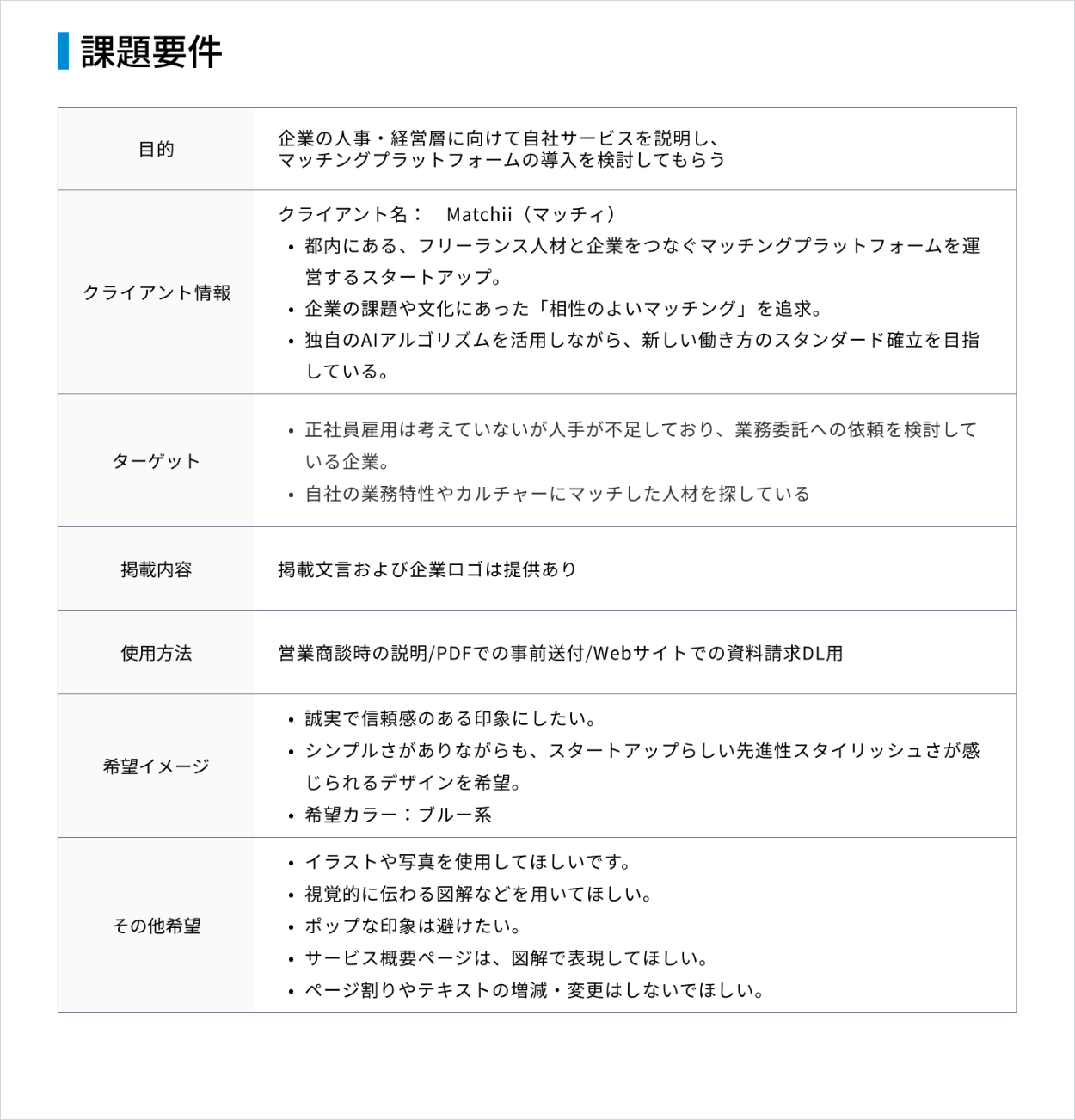 時系列に沿ったステップごとの図解で、複雑な登録やマッチングの工程も「次に何をするのか」を明示。これにより、サービス導入時のクライアントの不安を解消し、スムーズな検討・意思決定を支援する構成に仕上げました。