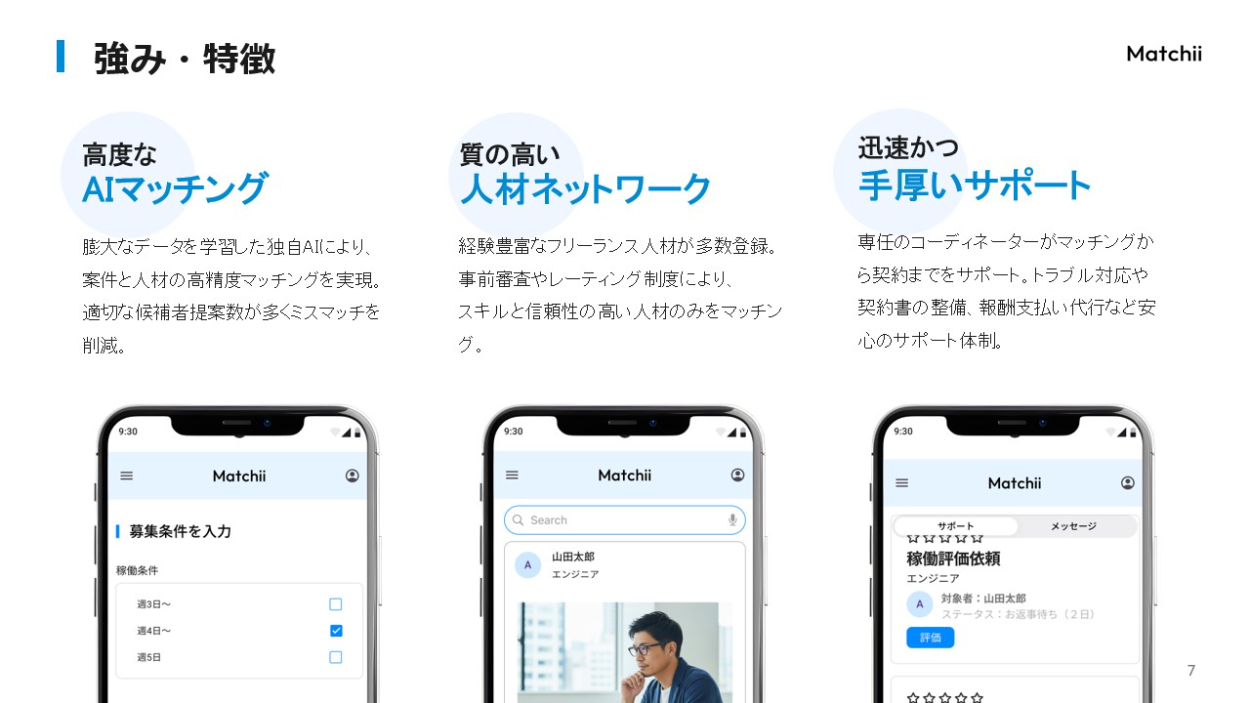 サービスの「強み」を伝える際、文章だけでなくアプリ画面のビジュアルモックを制作し、視覚的にも魅力が伝わるよう工夫しました。