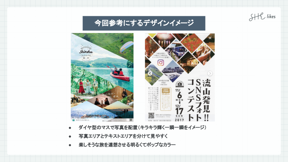 ・テキストエリアを真ん中に大きく配置することで、情報が目に入りやすいようにしました。一番目立たせたい「旅フォトコンテスト」については、テキストを部分的に丸にしたり色を変えたりすることで、旅のワクワク感を表現しました。