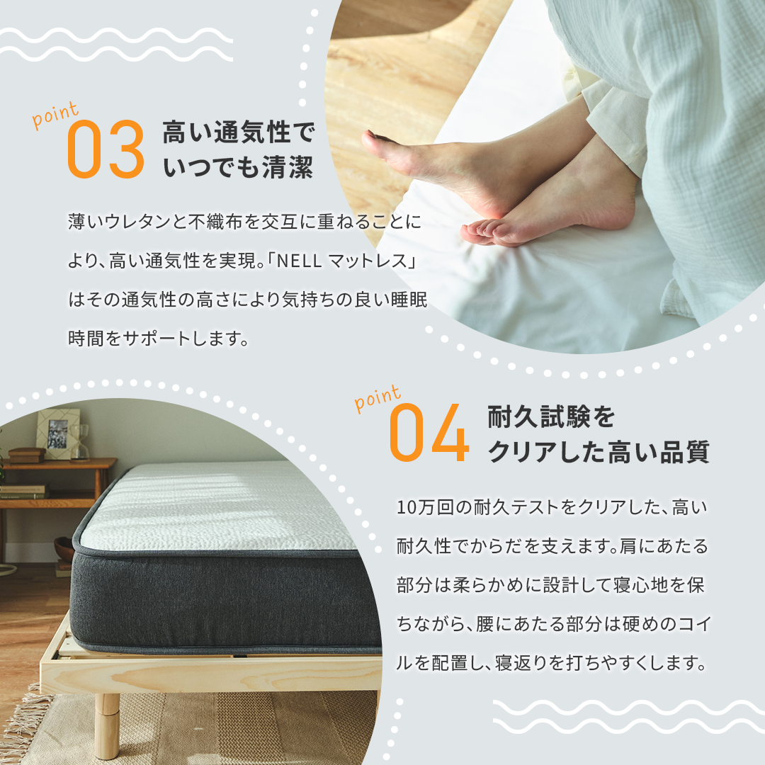 冒頭で「マットレスにこだわったら朝の目覚めが快適に」というキャッチコピーを配置し、使う人が実感できる“朝の爽やかさ”を最初にイメージさせています。→商品の特徴や魅力を4つのポイントに分けて簡潔に整理することで、短時間でも機能性を理解しやすく途中で離脱しないように情報量に調整しました。→最後に「120日間のフリートライアル・送料無料」といった特典をCTAとして強調し「安心して行動につなげられる導線を意識しています。