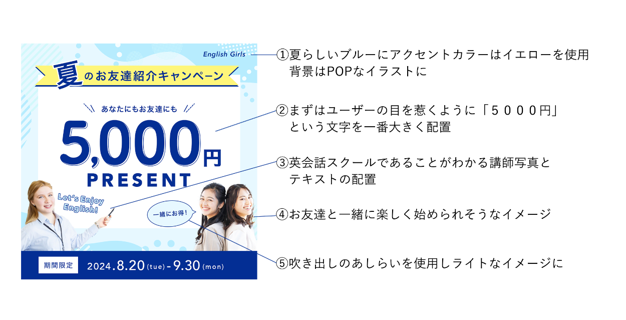 夏らしくPOPなイメージのデザインにするには、配色やフォント、背景やあしらい等、様々な方法で演出できることを学びました。