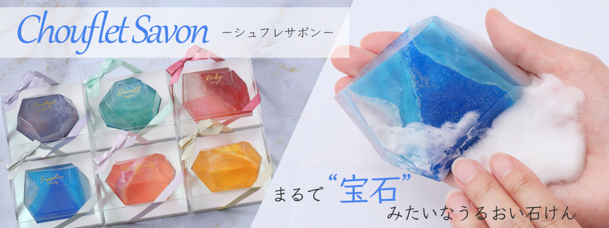 ・宝石をモチーフにした石鹸というのを特にアピールしたかったので、「宝石」という文字が目立つように、他のフォントより大きくし色を変えました。