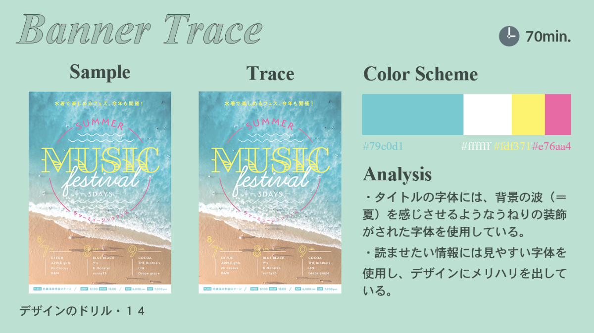 ・背景全体に砂浜・波のイメージを用いることでイベントの時期を全面的に感じさせている。