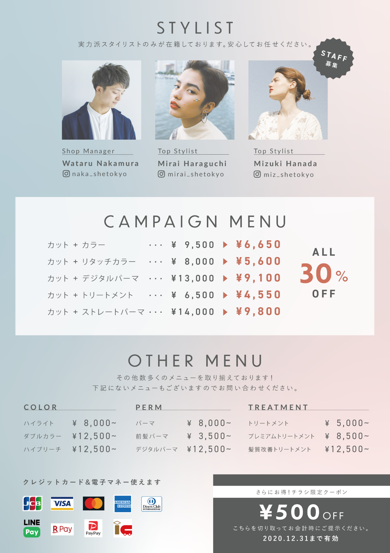 裏面は「確かな腕のスタイリストに担当してもらいたい」というターゲットのニーズに合わせてスタイリスト情報を一番上にしました。スタイリストの写真だけでなくSNS(Instagram)のアカウントを表示することで、より多くの情報にアクセスできるようにしました。500円OFFのクーポンに気付いてもらうために、濃い色を使って目立たせました。